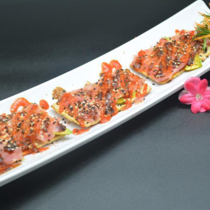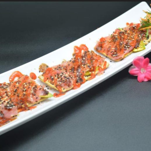 3 tostadas: Montadela sobre aguacate, philadelphia, togarashi, arúgula, salsa spicy, cebollín y sriracha.