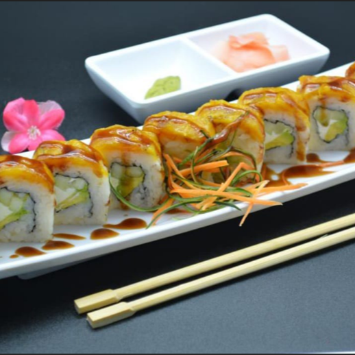 Pd: aguacate, pepino, philadelphia y camarón. p.f: plátano frito bañado con nuestra salsa anguila.