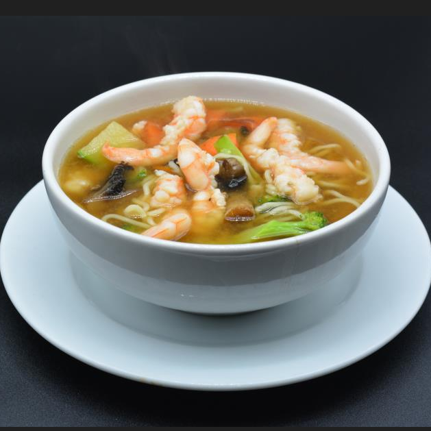 Sopa caliente de ramen con camarón, que ofrece un caldo reconfortante y lleno de sabor.