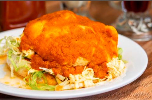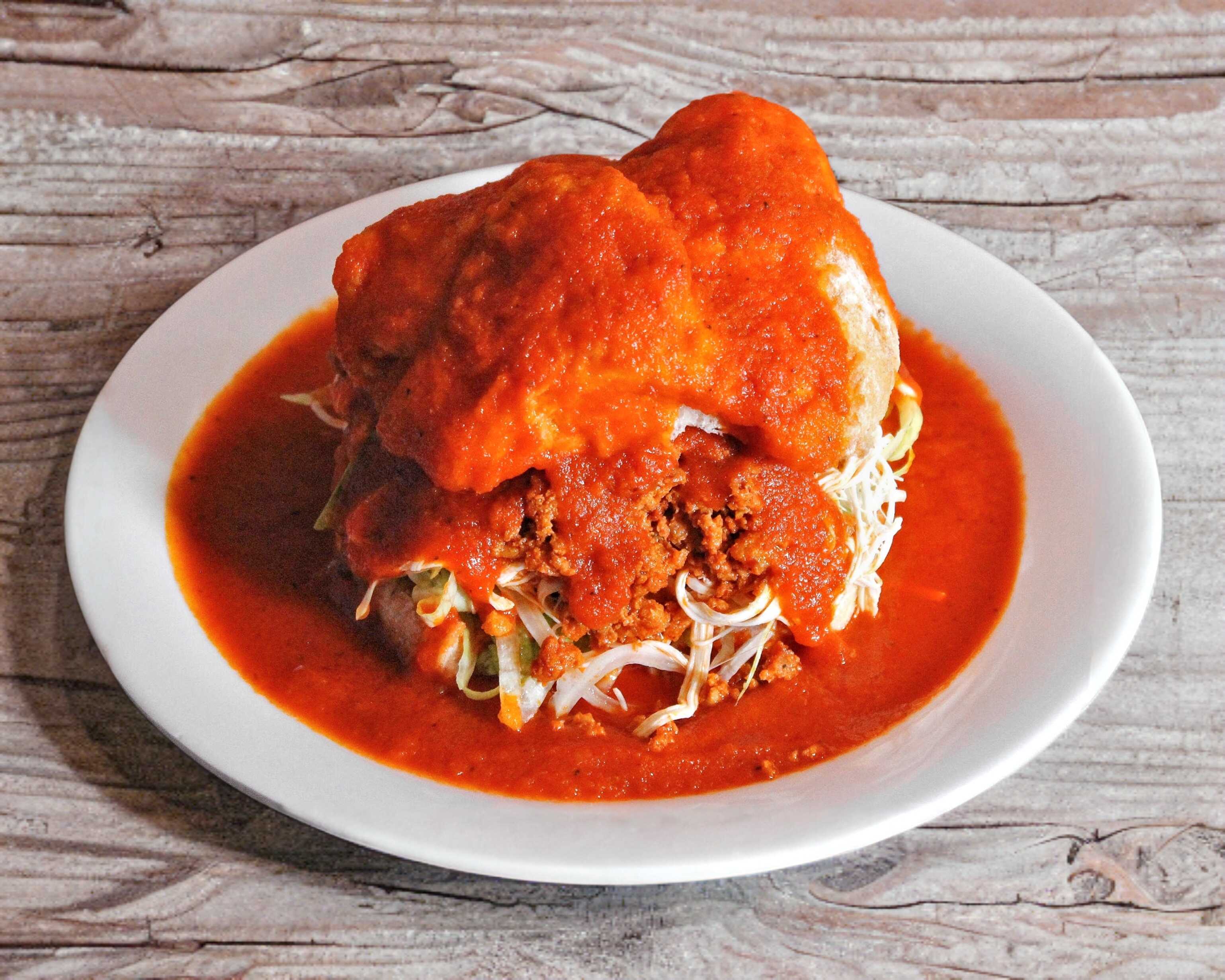 Pan relleno de guacate,lechuga,quesillo y cebolla bañado en salsa de chile guajillo