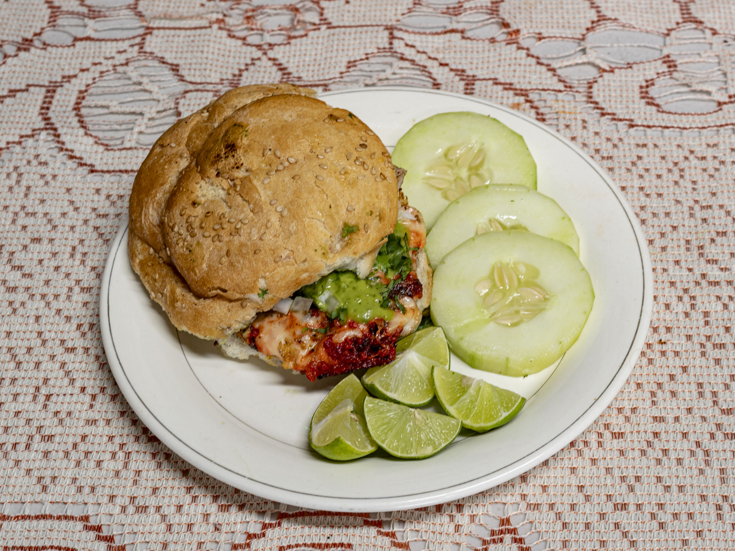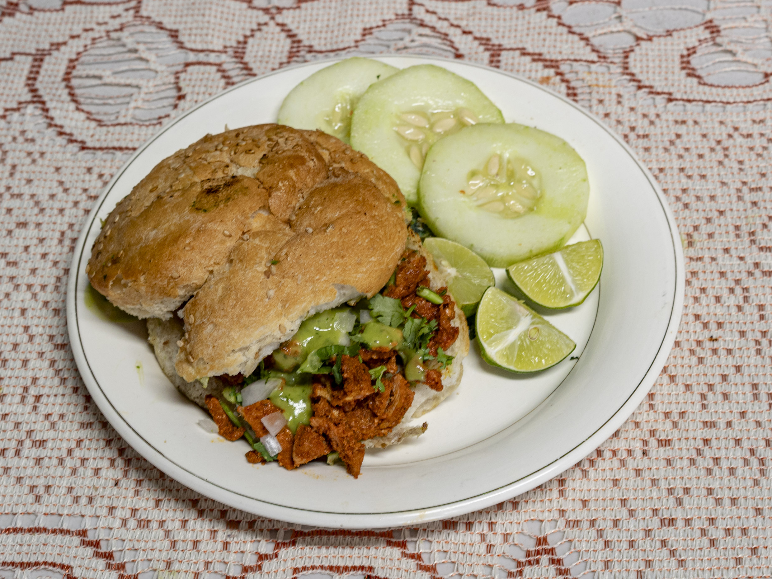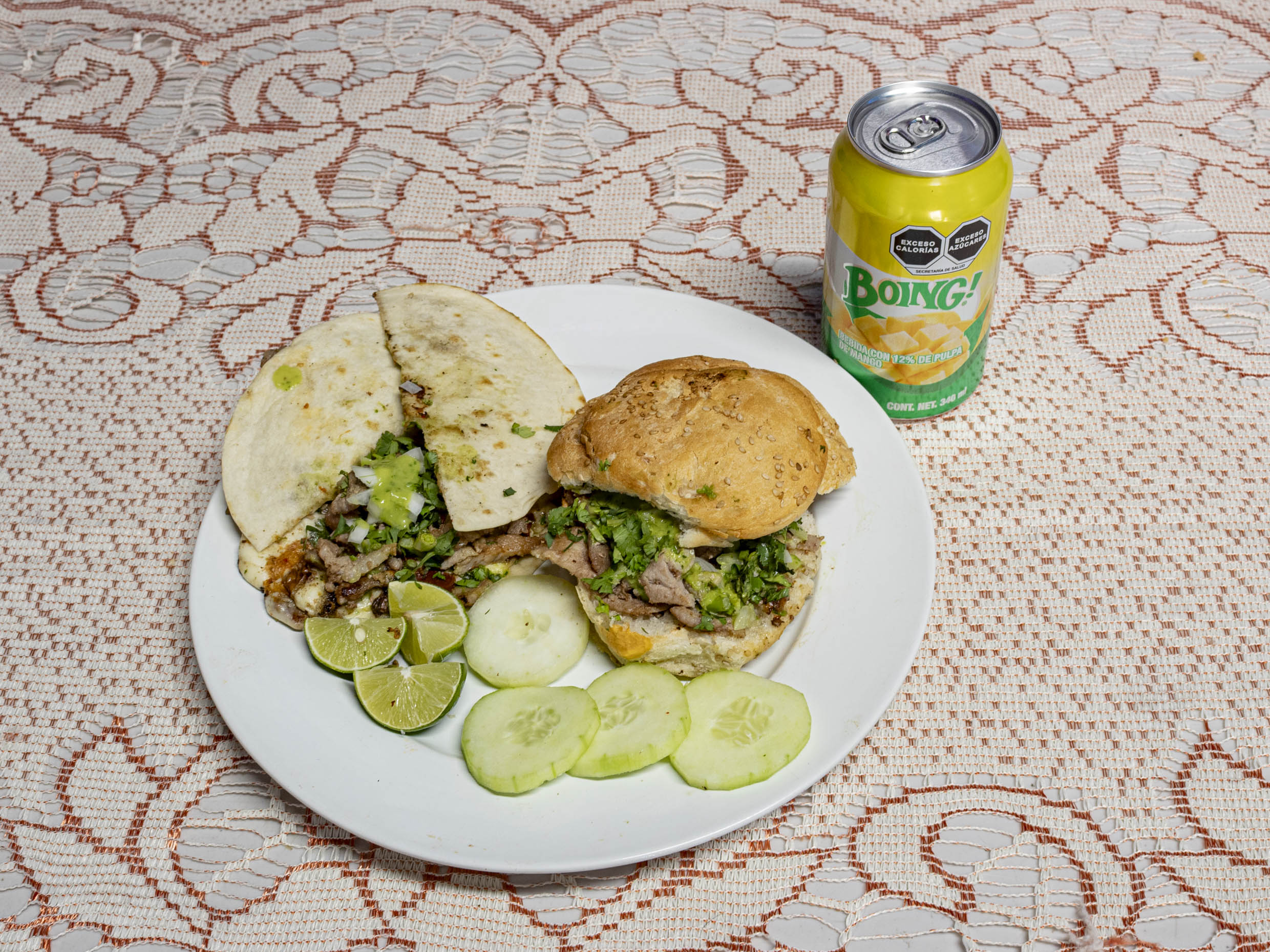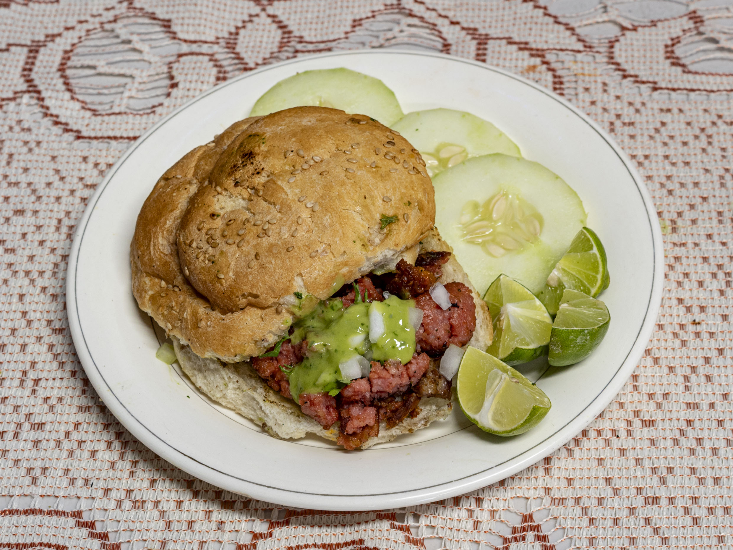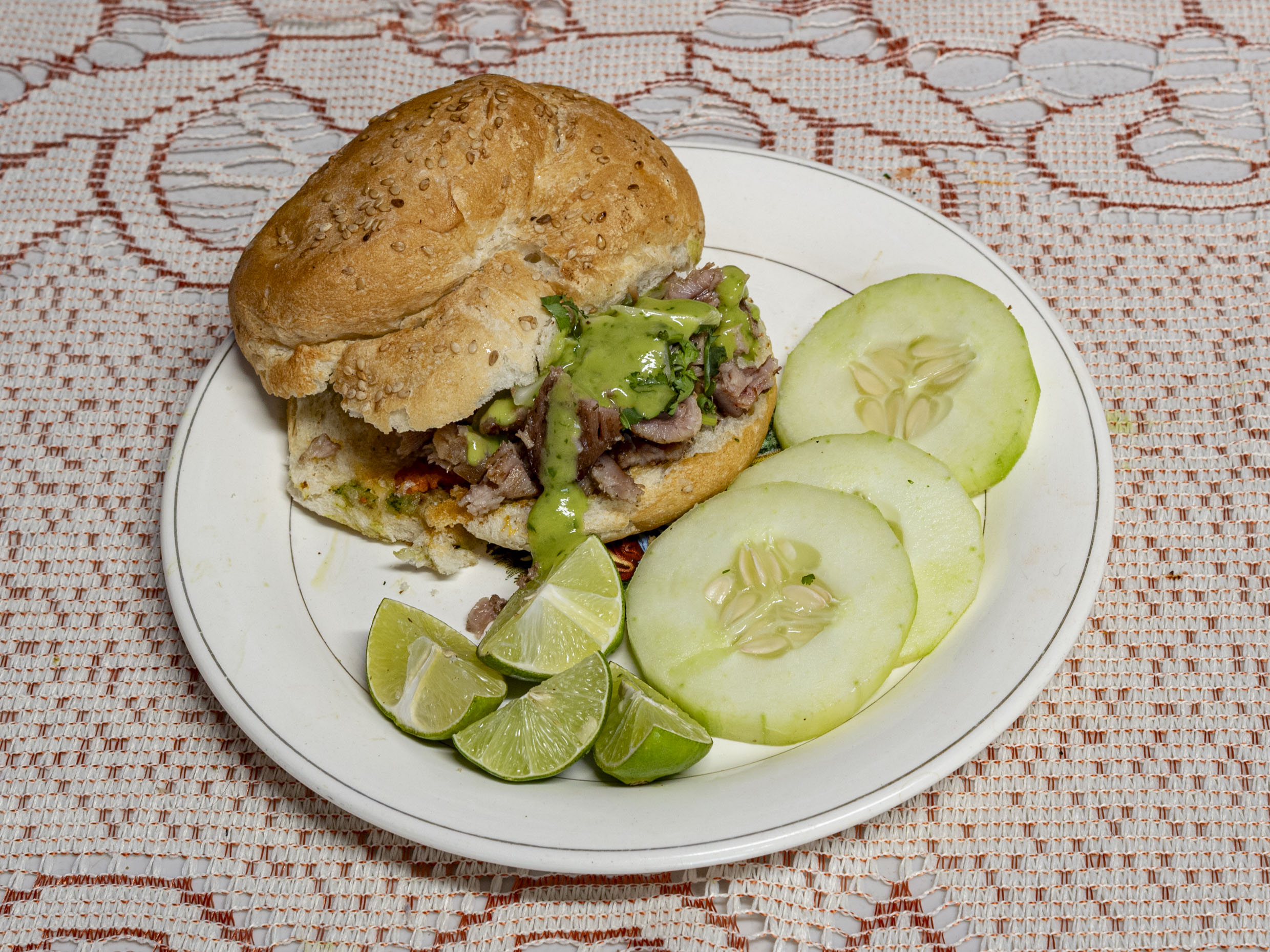 Cemita de Carne Enchilada, acompañados con verdura, limones, guacamole y salsa verde, salsa roja