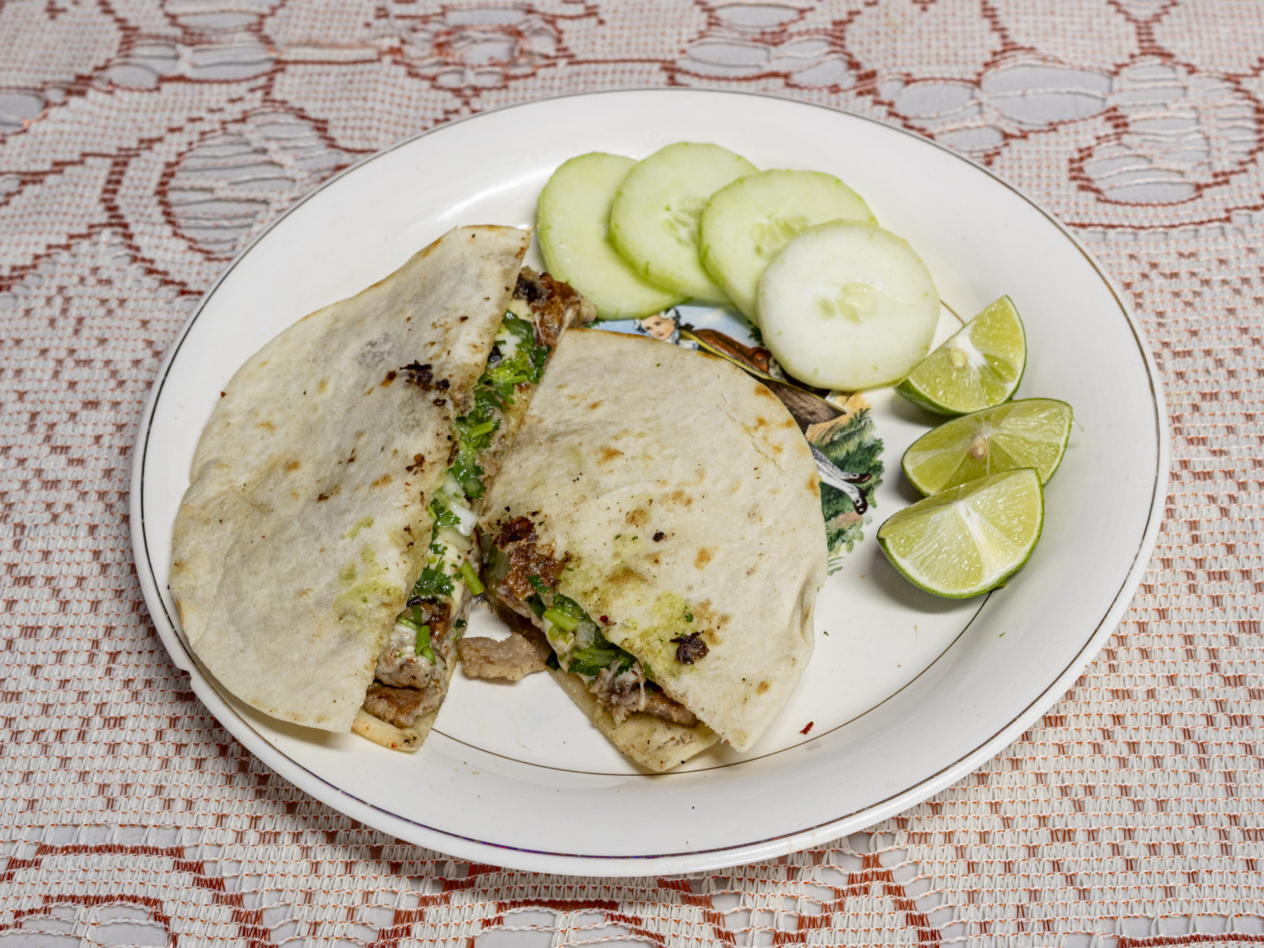 Tortilla de harina con jugosa carne asada,queso fundido guacamole cilantro y cebolla