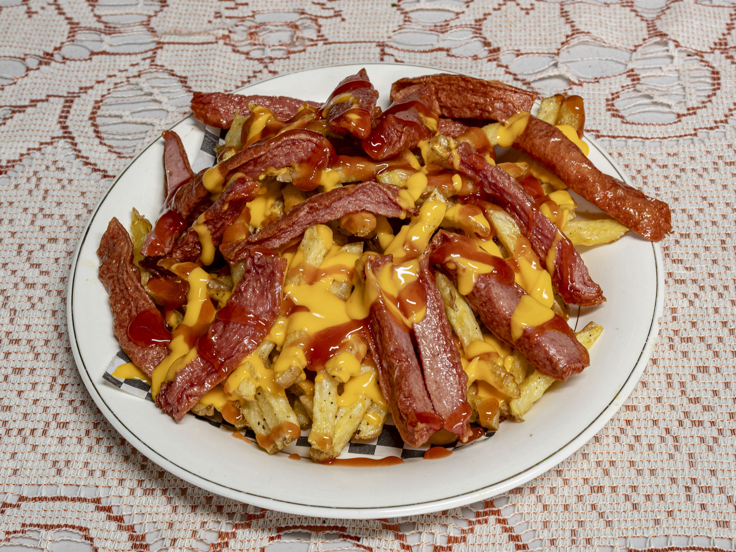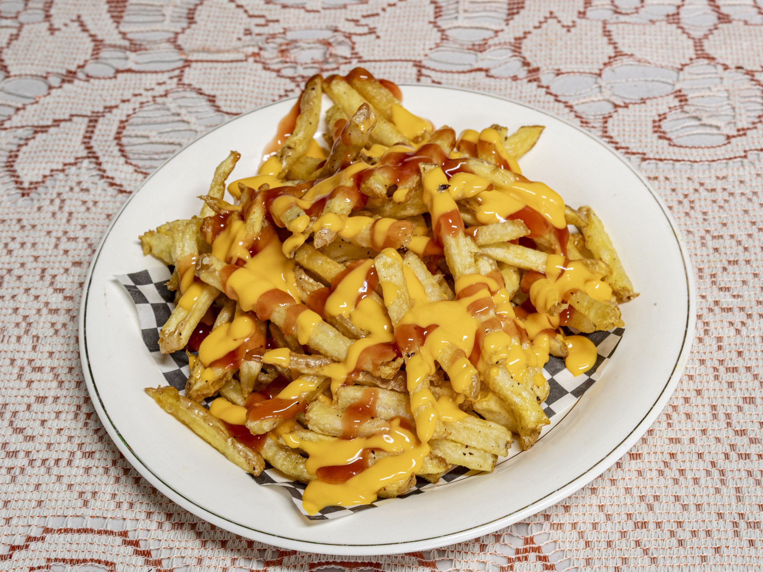 Orden familiar de papas a la francesa con queso y catsup(contenedor 7x7)