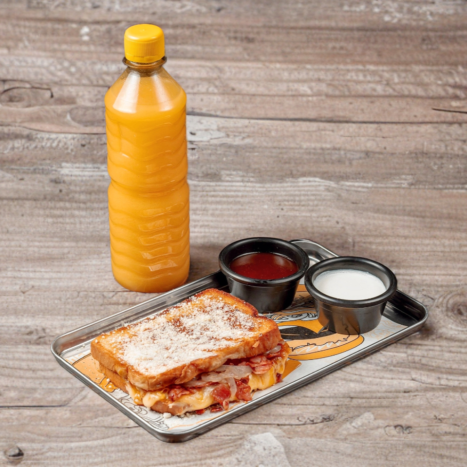 Grilled Cheese 4 Quesos*1 + Agua de Jamaica 500ml*1 + Cebolla Caramelizada*1 + Tocino*1