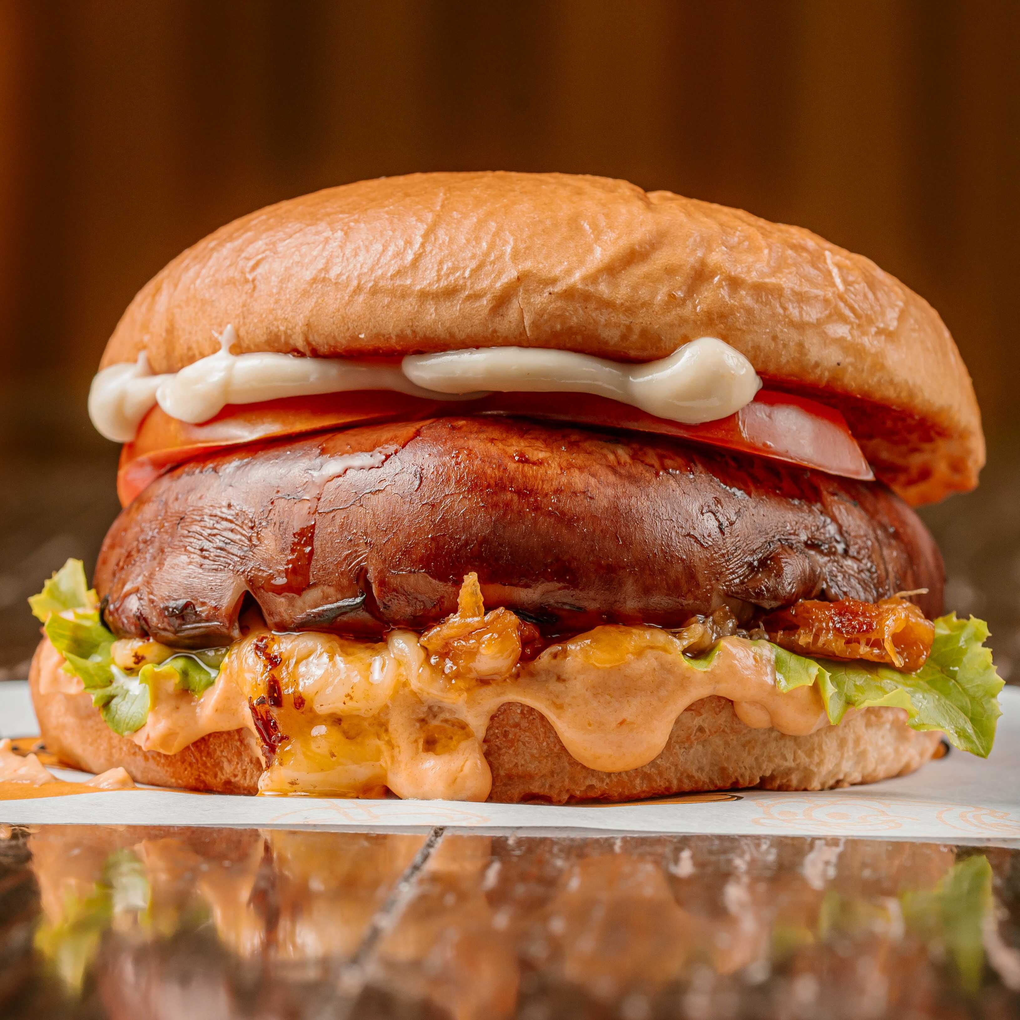 Hamburguesa de hongo portobello frita en una combinación de especias, sazonada y con una mezcla de quesos, aderezo especial.