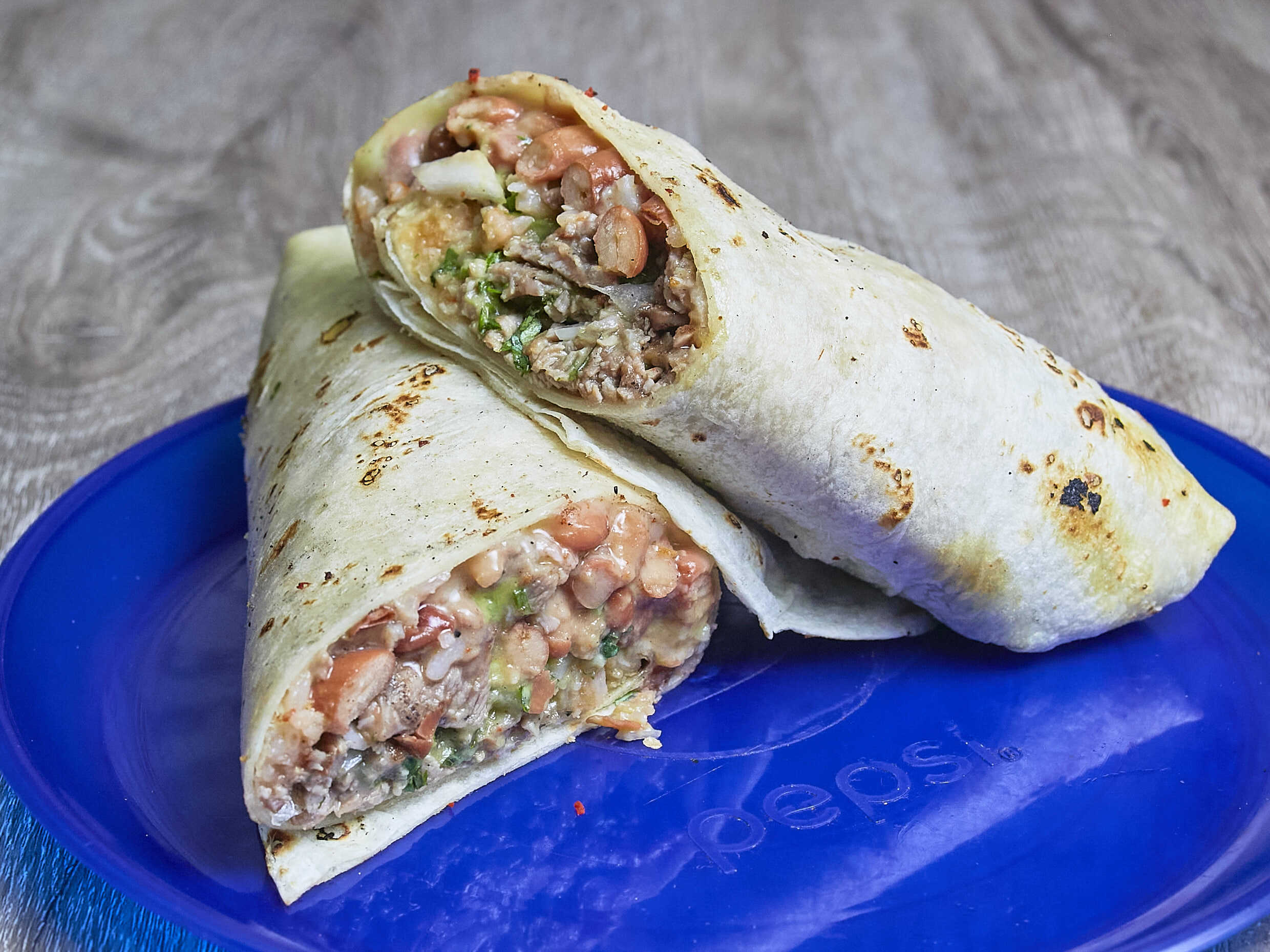 Tortilla de harina, queso manchego, guacamole, carne a elegir y verdura.