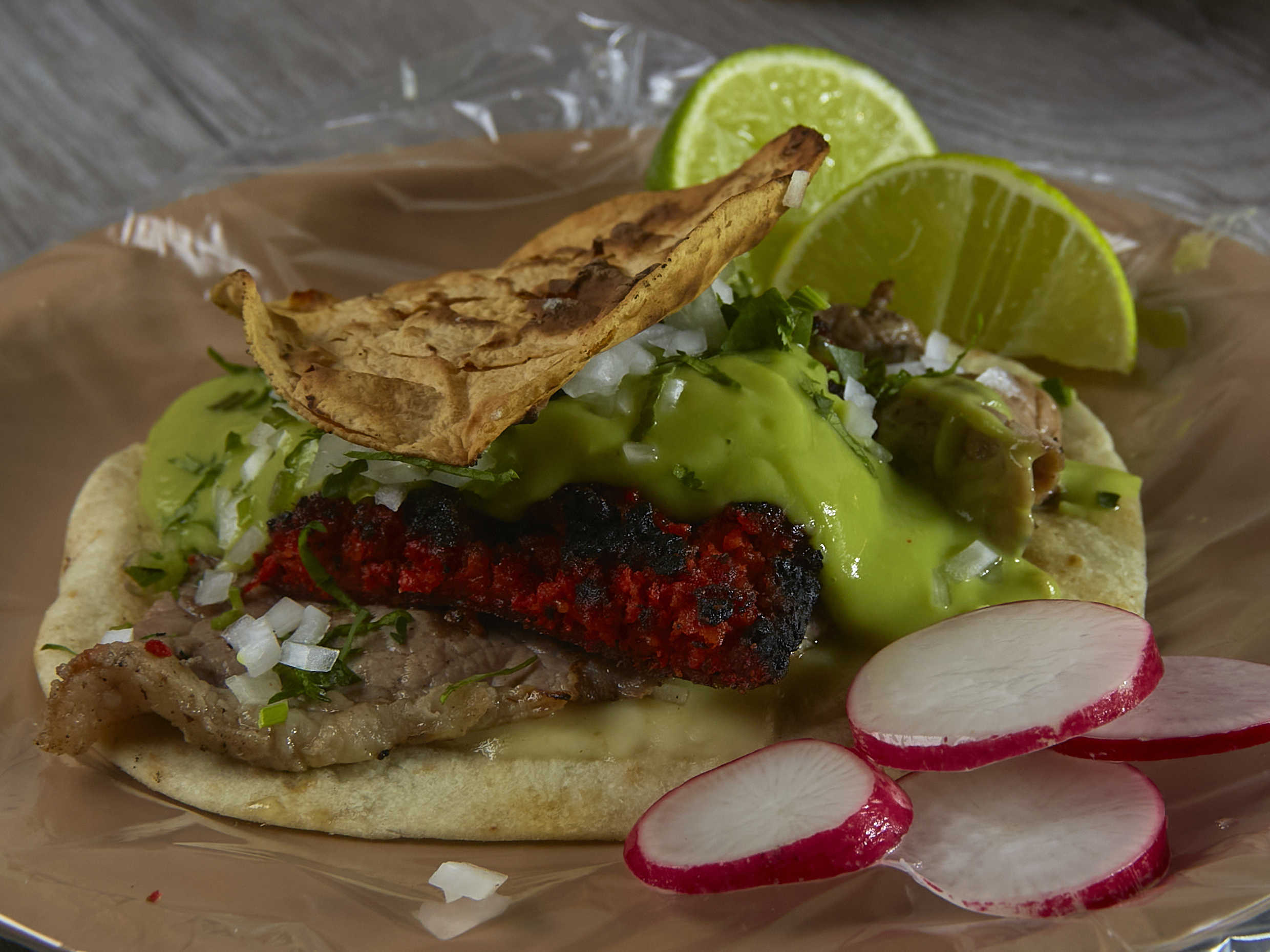 Taco en trozo combinado, con su dosis perfecta de guacamole cremoso.