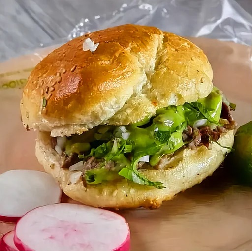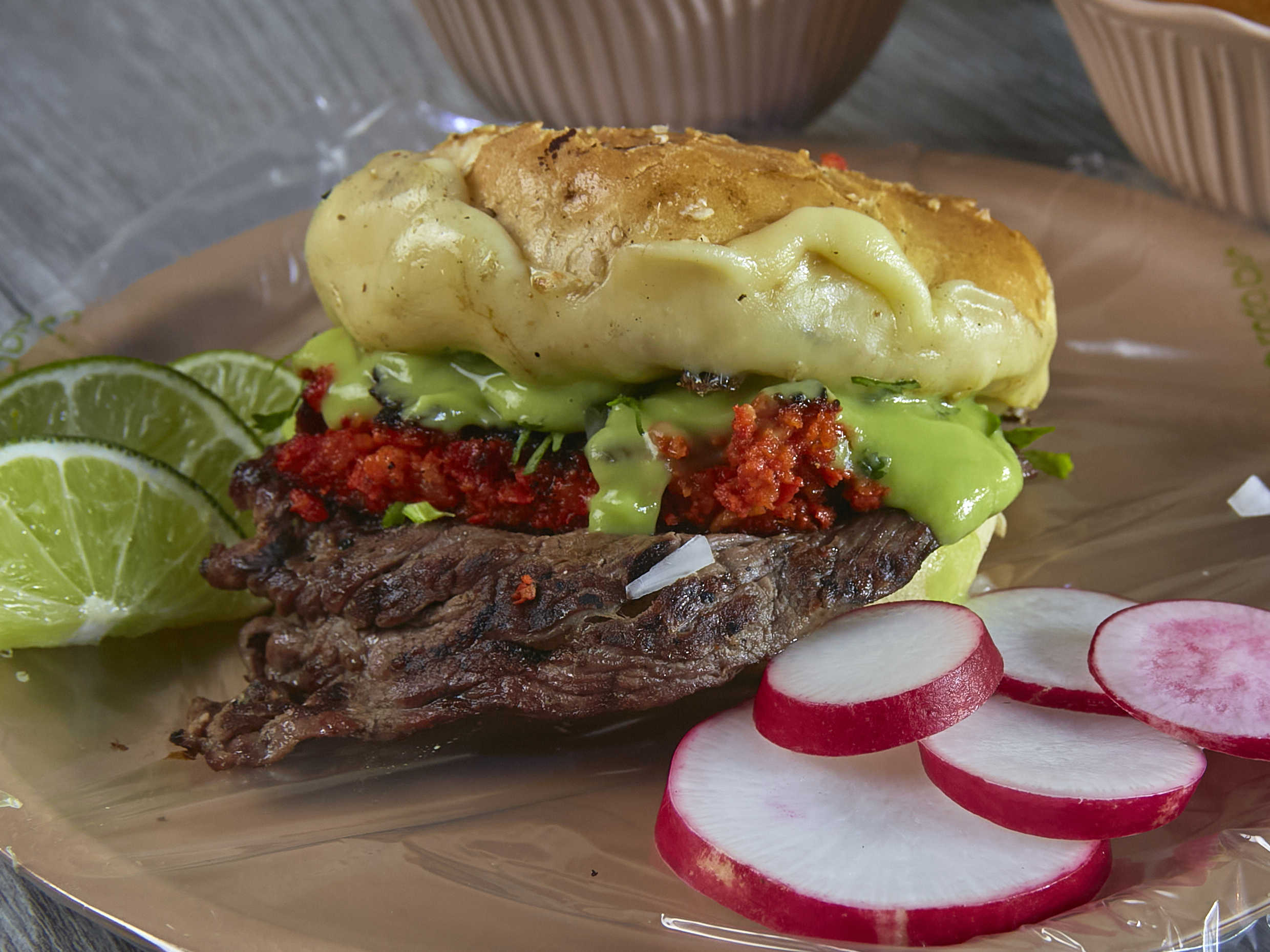 Cemita generosa de arrachera jugosa, acompañada de queso, guacamole y verdura fresca.