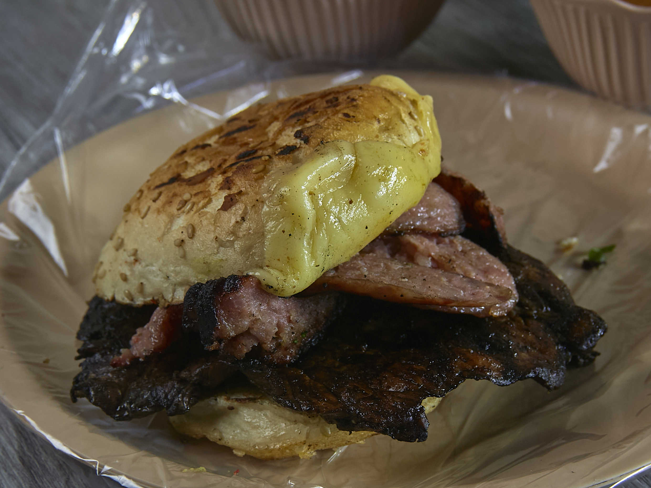 Cemita con queso manchego y 1 trozo de carne de arrachera y 1 trozo de chorizo.