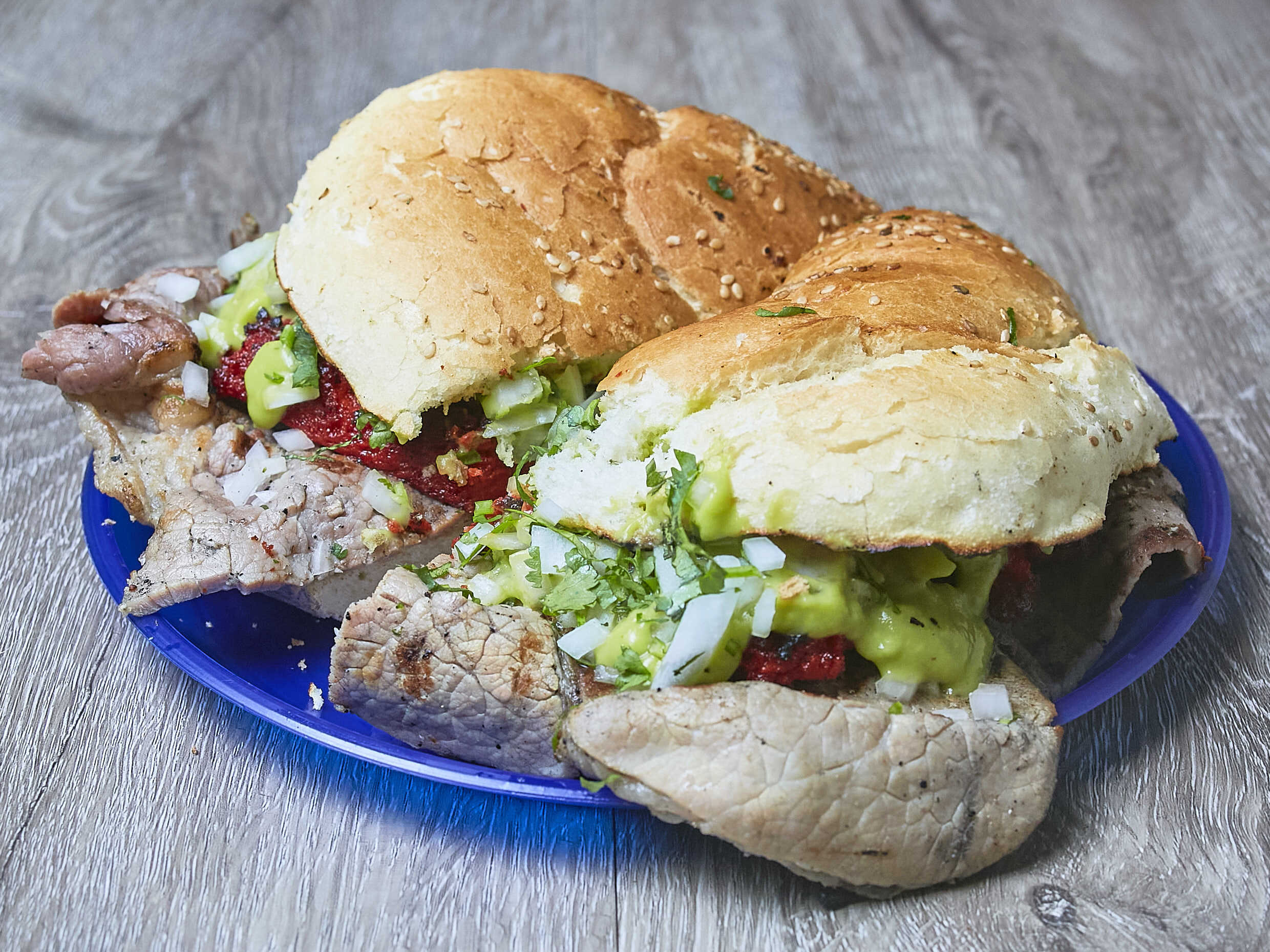 Cemita de arrachera, con su dosis perfecta de guacamole cremoso.