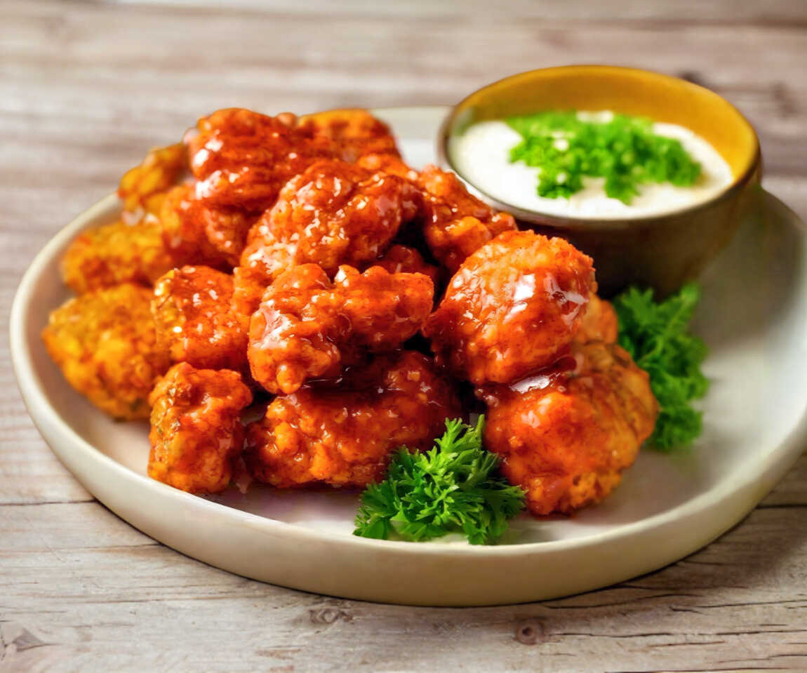 Un waffle dorado y esponjoso sirve de trono para jugosos boneless bañados en una intensa salsa buffalo. La mezcla de quesos derretidos envuelve cada bocado, tiras de blue cheese y un toque de cremoso ranch
