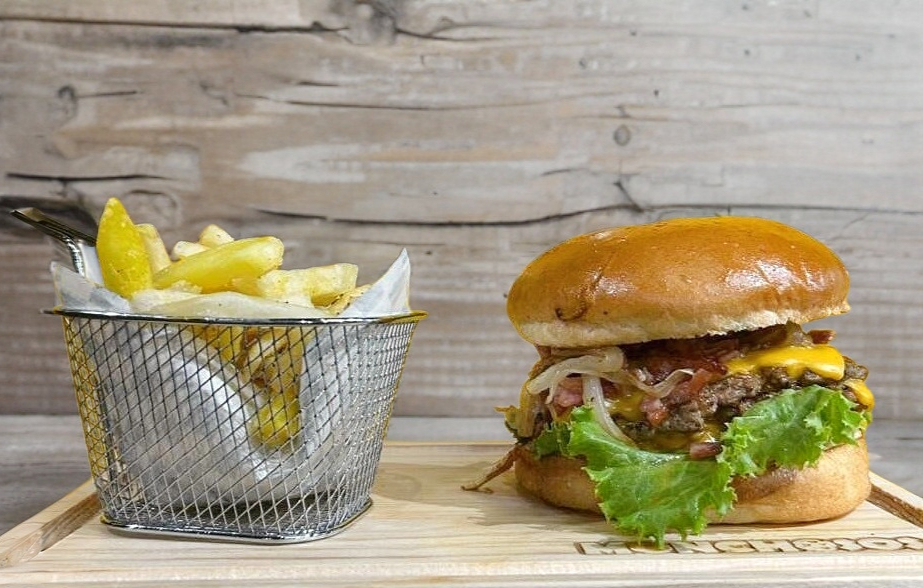Pan brioche dorado, mayo de habanero, lechuga fresca, carne jugosa, queso cheddar derretido y un jalapeño relleno de queso crema, envuelto en crujiente tocino y coronado con cebolla caramelizada