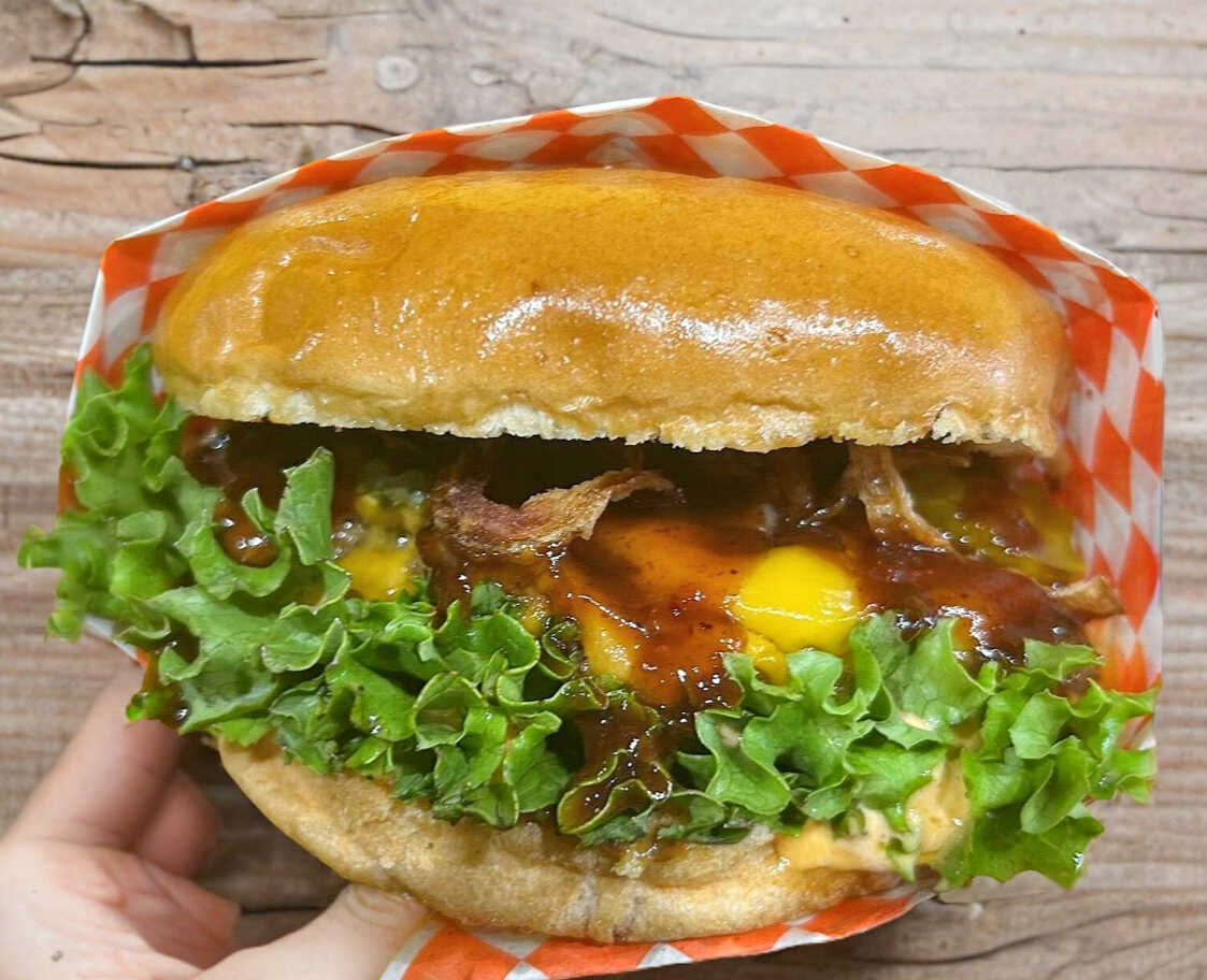 Pan brioche esponjoso, aderezo chipotle cream, lechuga fresca, doble carne bañada en salsa BBQ, queso cheddar derretido, pepinillos, crujiente tocino y una lluvia de cebolla crispy