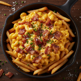Macarrones bañados en salsa de Queso a elegir entre: Cheddar o tipo Fondue sobre una cama grande de papas a la francesa, con trocitos de tocino doradito y queso parmesano rallado.