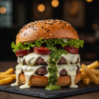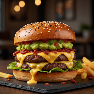 Pan artesanal, 160 g de carne premium de res, con guacamole, chorizo frito, quesos gratinados, aderezo ranch y lechuga.
