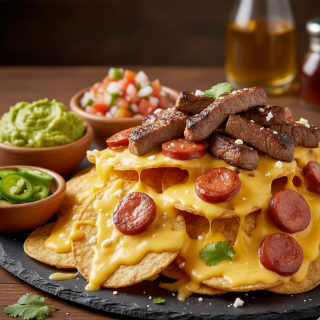 Nachos (1-2 personas) con proteína a elegir entre: arrachera o chistorra, se acompañan con: queso amarillo, guacamole, salsa pico de gallo con un toque picante, rodajas de jalapeño y un aderezo a elegir.