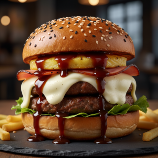 Pan artesanal, 160 gramos de carne de res y cerdo, mezcla de quesos gratinados, piña y jamón asado, salsa BBQ Hot, lechuga.