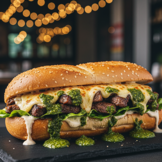 Baguette artesnal horneado con mantequilla con ajo, arrachera de res, costra de quesos, salsa chimichurri casera, aderezo ranch y lechuga.