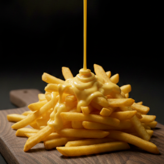 300 g de papas a la francesa extra crujientes sazonadas con especias, bañadas con salsa de queso a elegir, proteína a elegir, mucha salsa de queso a elegir.