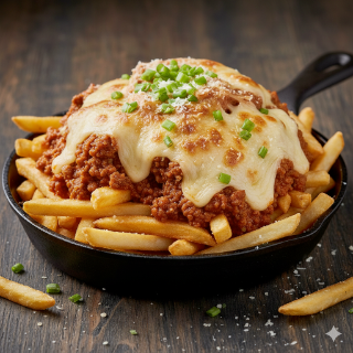 Orden grande de papas a la francesa extra crujientes bañadas en salsa bolognesa con carne de cerdo, quesos manchego y mozzarella gratinados, queso parmesano rallado, cebollín y tocino doradito