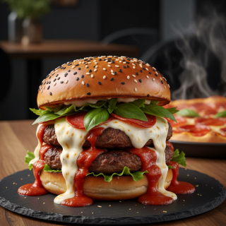 Pan brioche, 160 g de carne premium de res y cerdo bañada en salsa italiana, pepperoni doradito, queso mozzarella gratinado, albahaca fresca, aderezo ranch y lechuga
