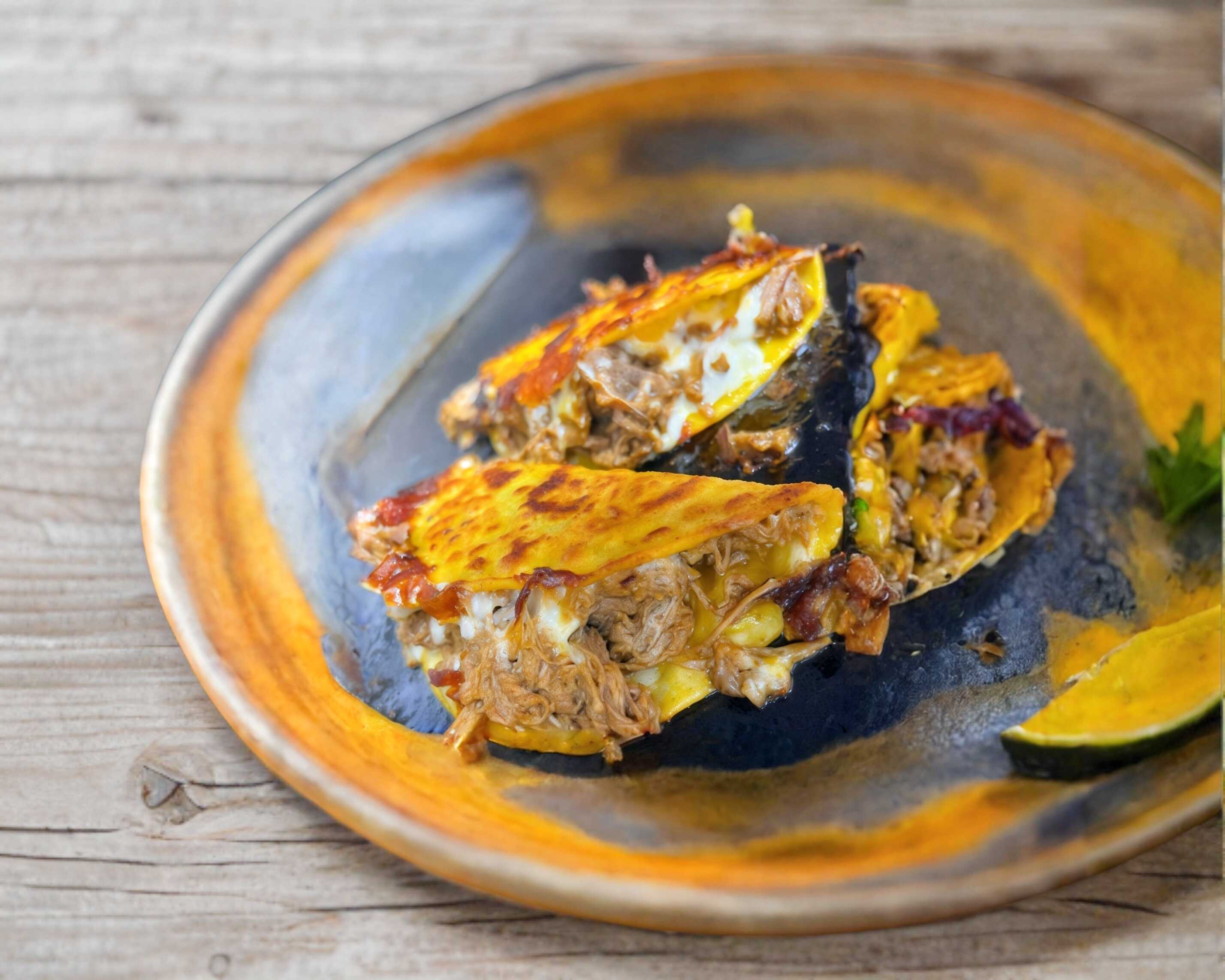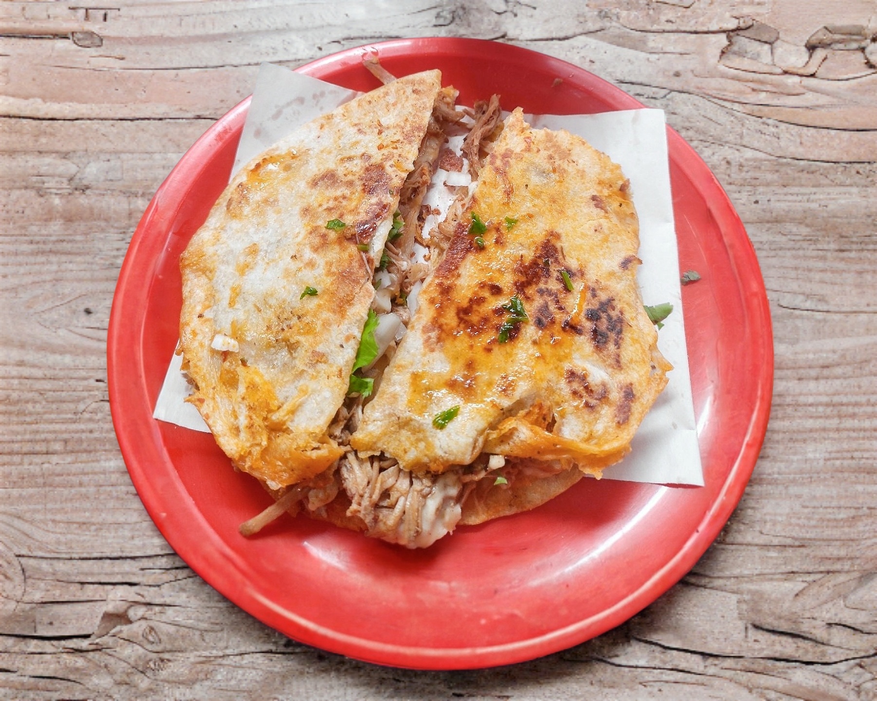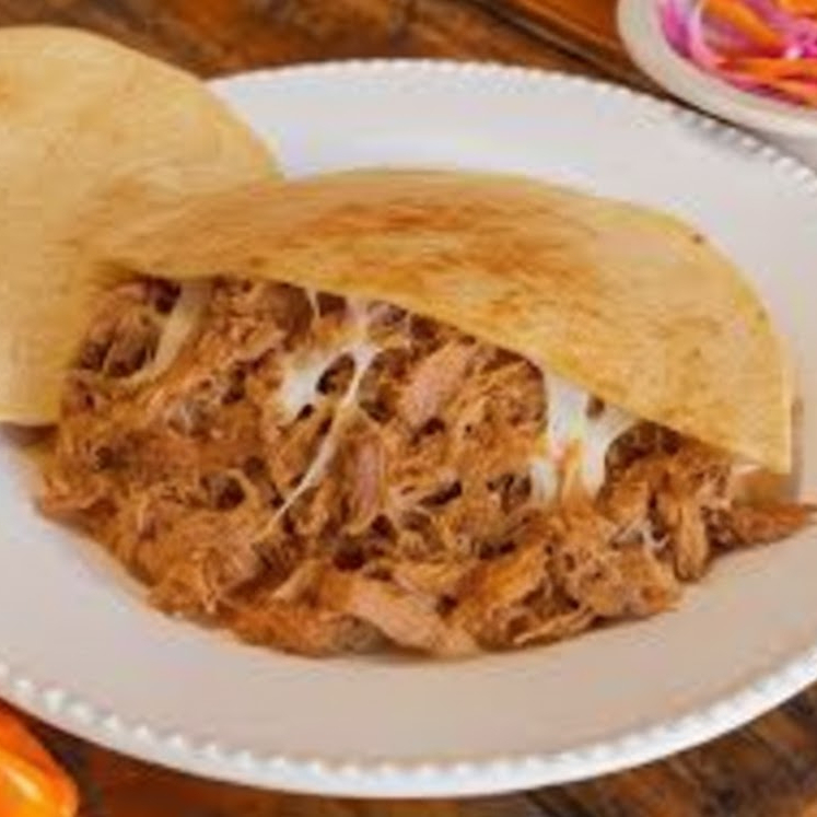 Doble tortilla de harina, cochinita pibil y queso mozzarella gratinado