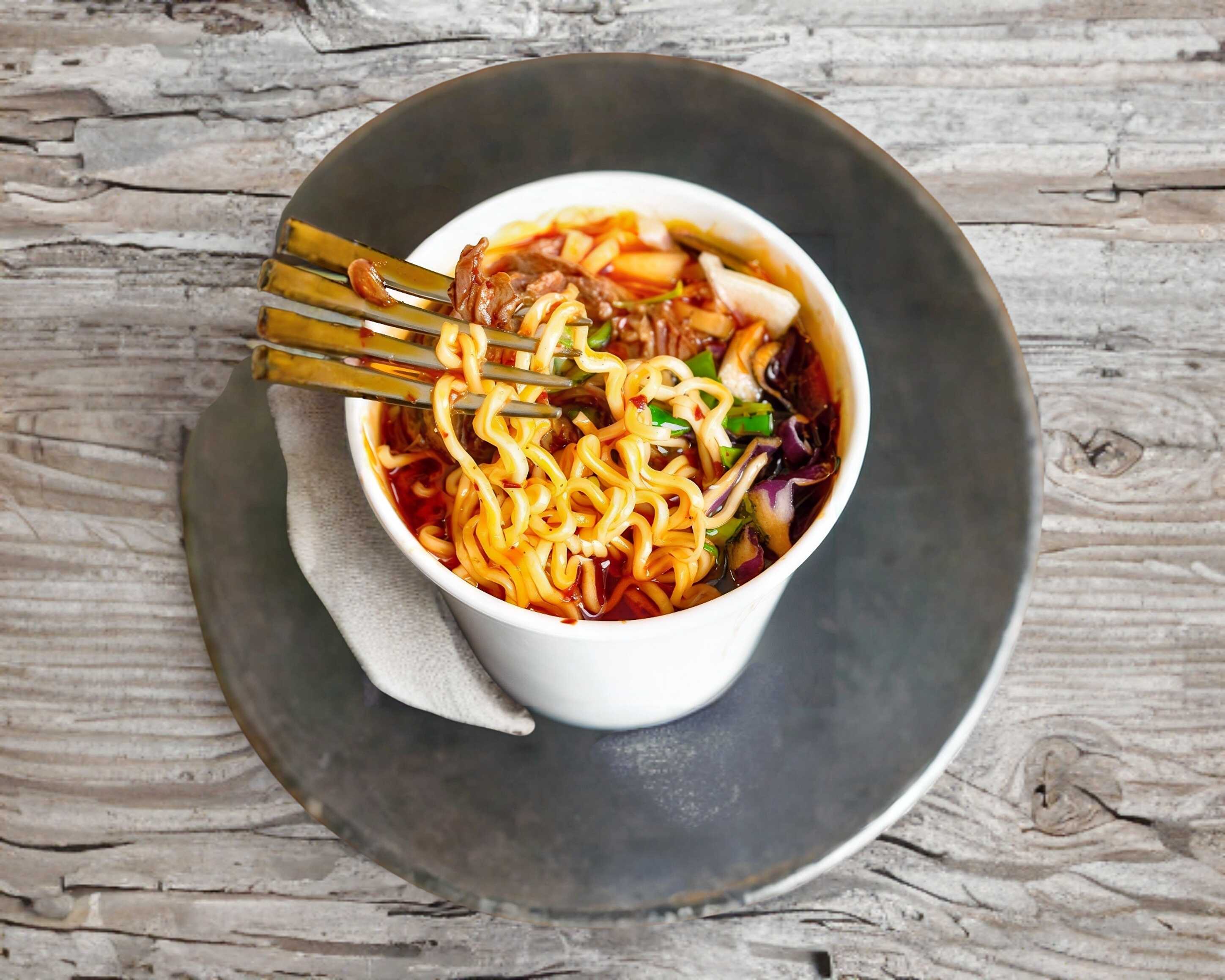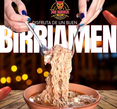 Ramen, en caldo de birria, con carne, queso y verdura.