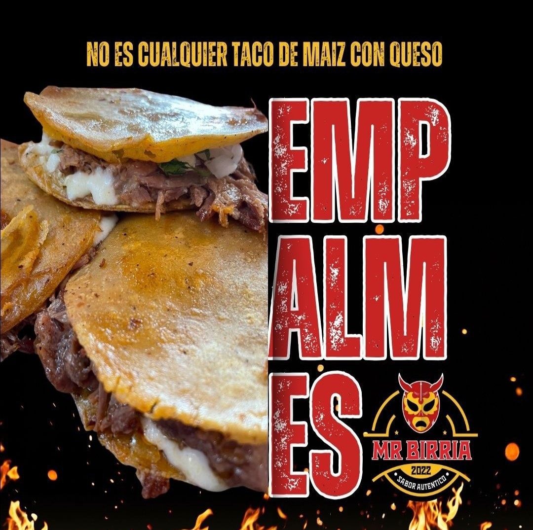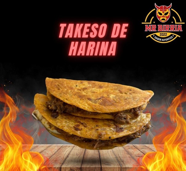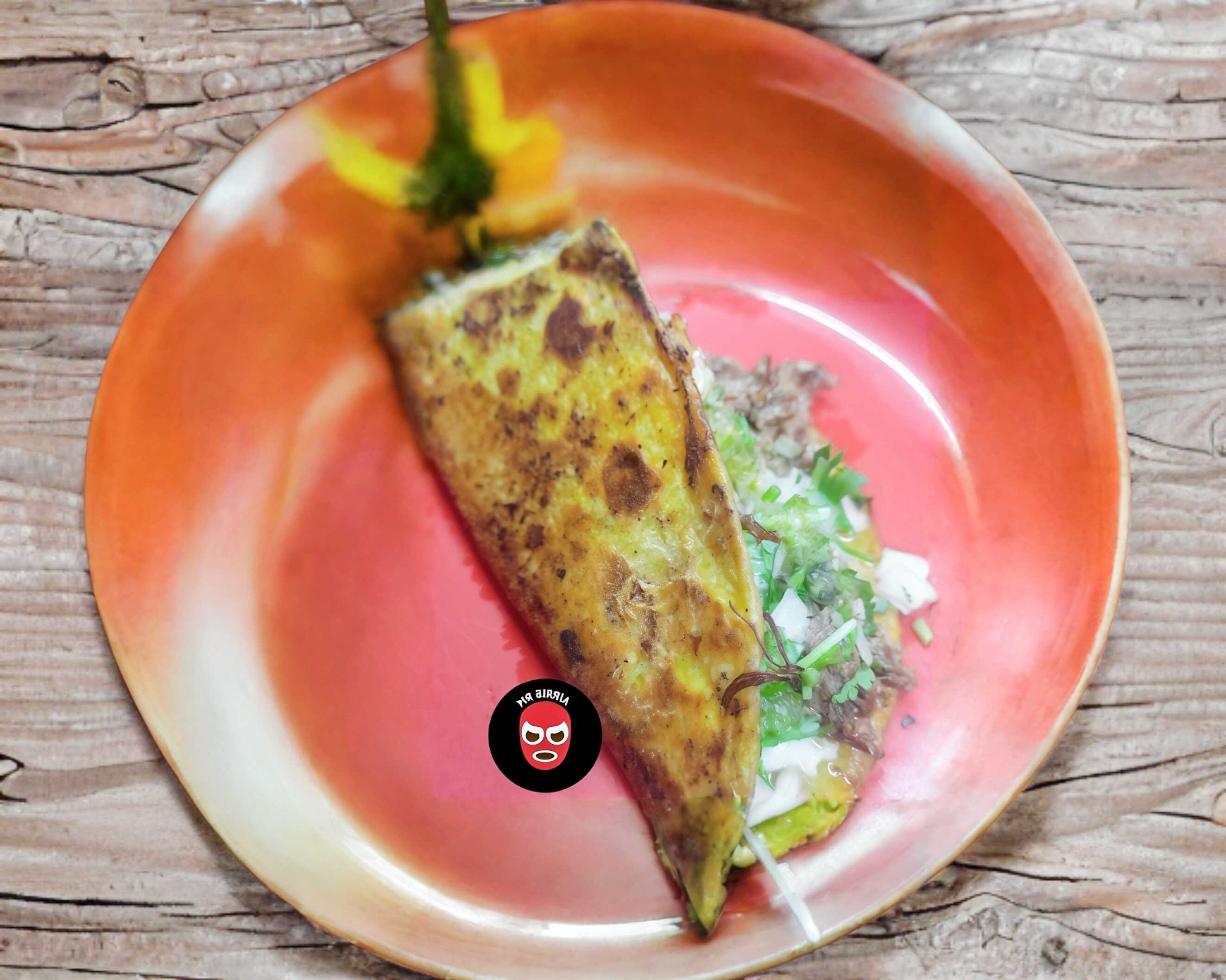 Doble tortilla de harina, con queso y carne de birria, incluye consomé de 200ml.