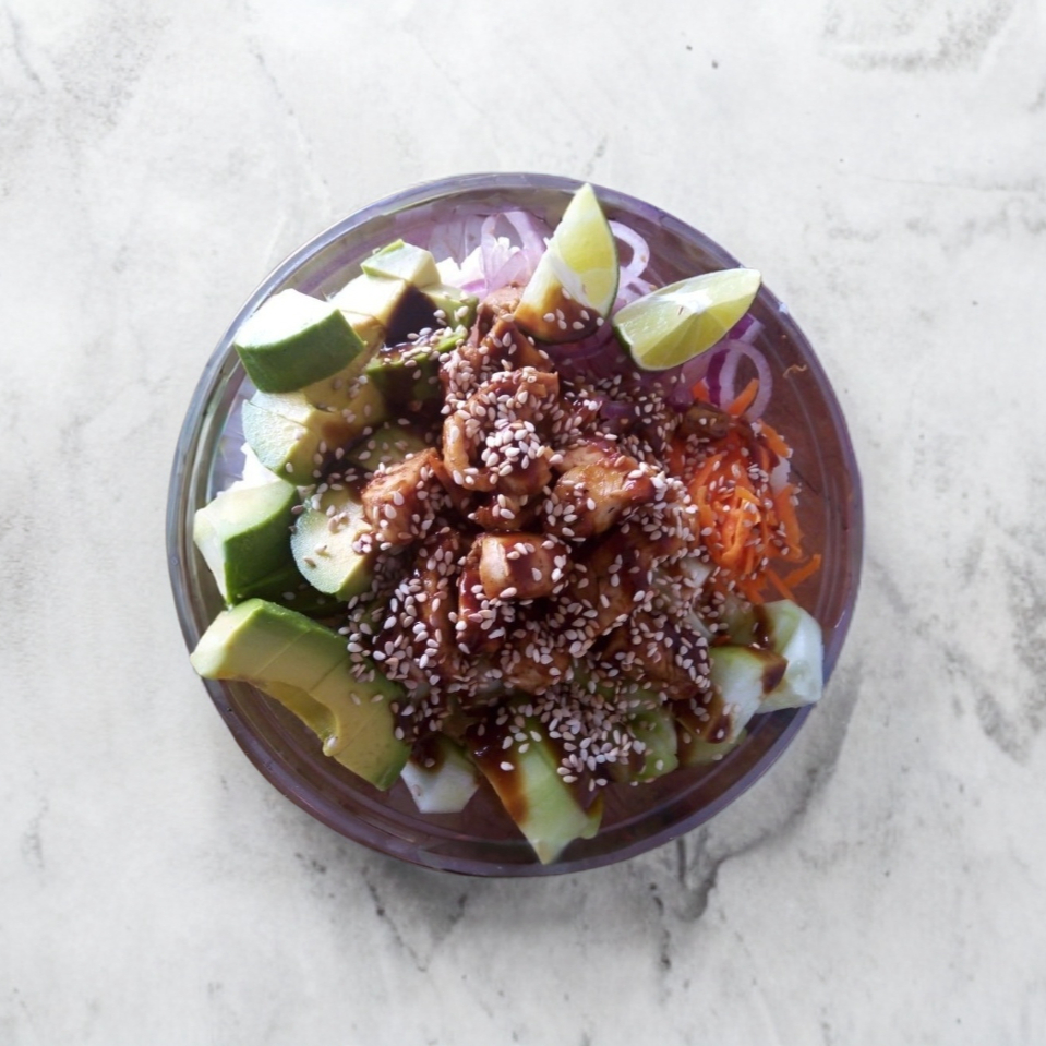Base de arroz Gohan,aguacate, jitomate, cebolla morada, pepino, semilla de ajonjolí y mayonesa siracha.