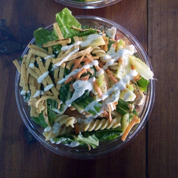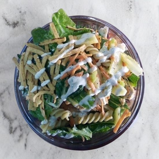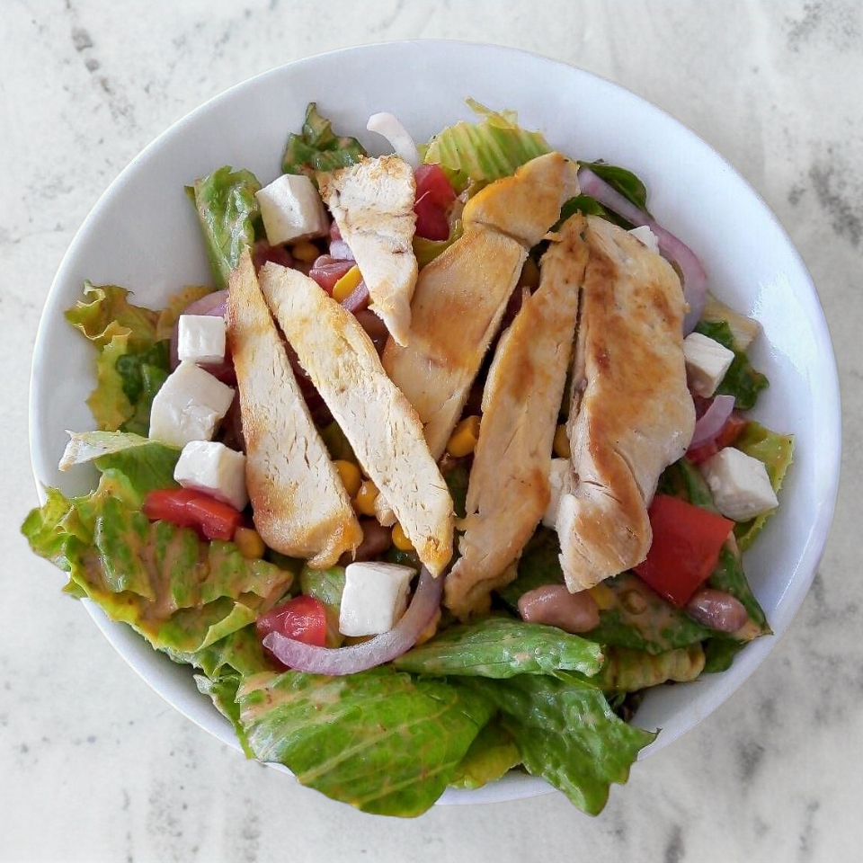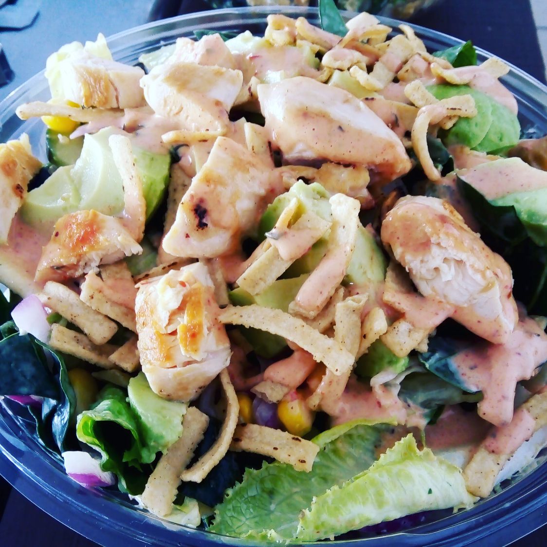 Base de lechuga y espinaca con pollo a la plancha, aguacate, granos de elote, pepino, calabacitas, cebolla morada, tiritas de tortilla y aderezo ranch chipotle.