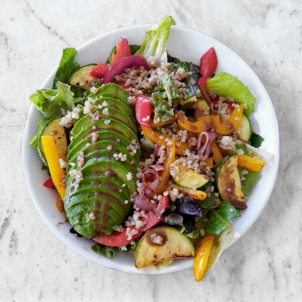 Lechuga romana, pimientos, cebolla, calabacitas rostizadas, quinoa, aguacate y aderezo vinagreta balsámica.