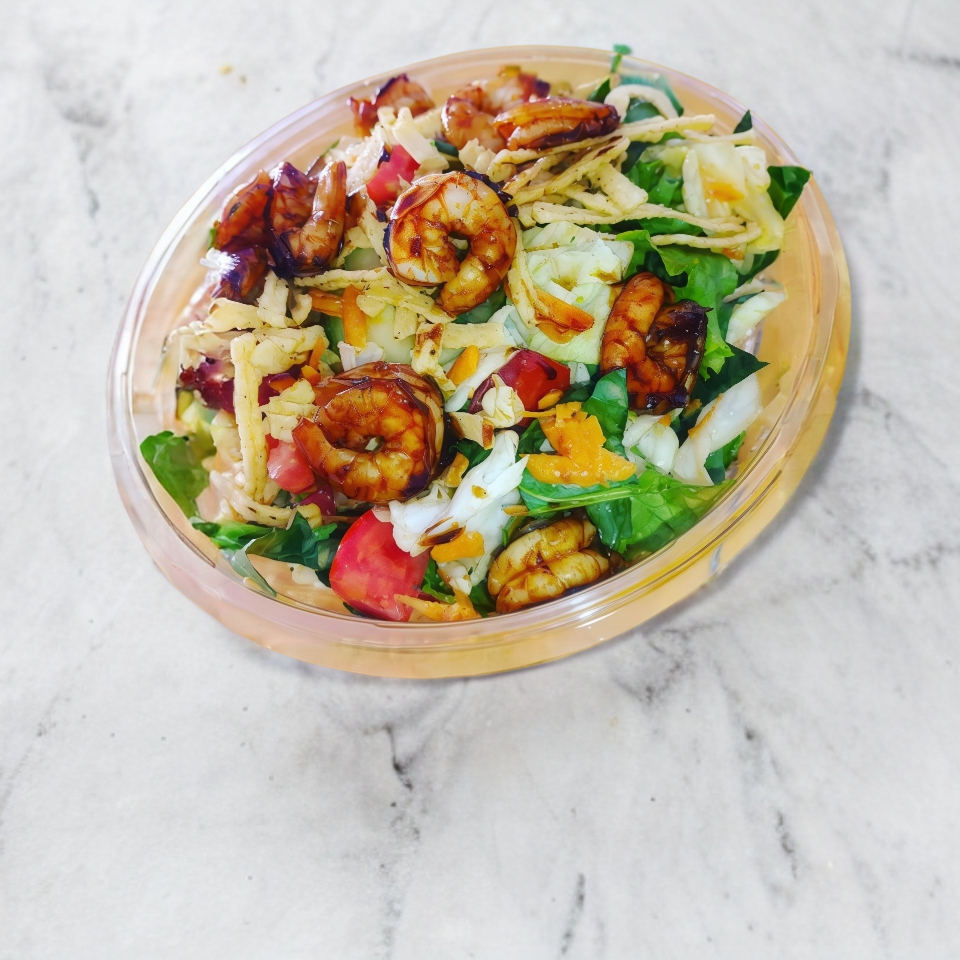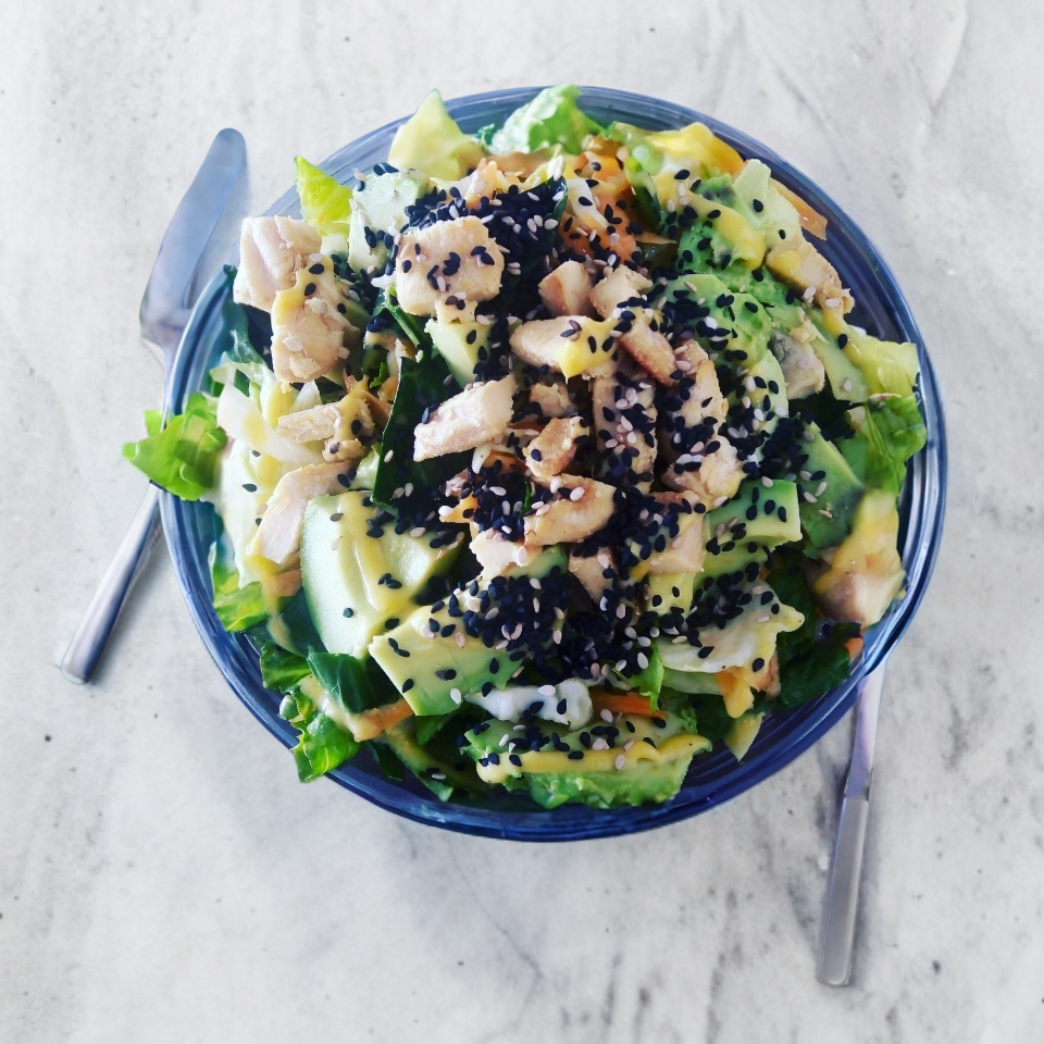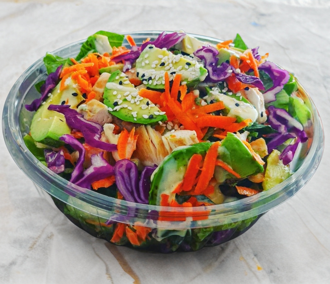 Base de lechuga y espinaca con pollo a la plancha, aguacate, zanahoria, apio, piña, col, ajonjolí tostado y aderezo de mango habanero.