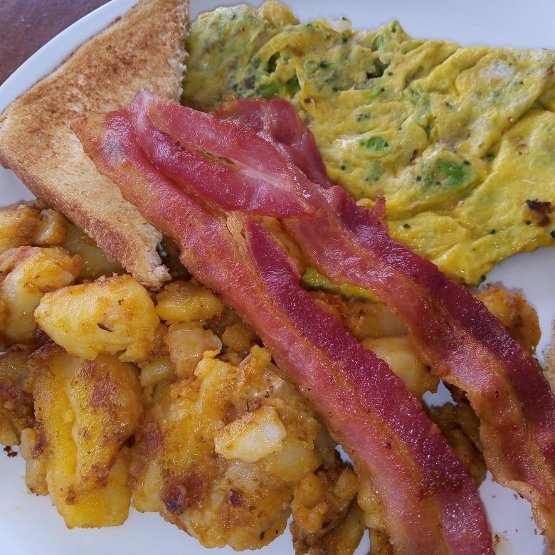 Dos huevos revueltos, acompañados de ensalada de la casa, tocino de pavo y pan tostado.