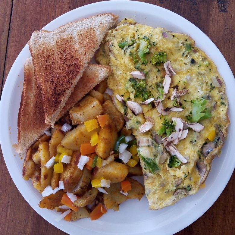 Dos huevos, brócoli, cebolla y champiñón, acompañados de ensalada de la casa y pan tostado.