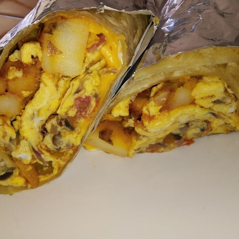 Dos huevos revueltos, con jitomate, cebolla, pimientos, mayonesa y papas de la casa en tortilla de harina.