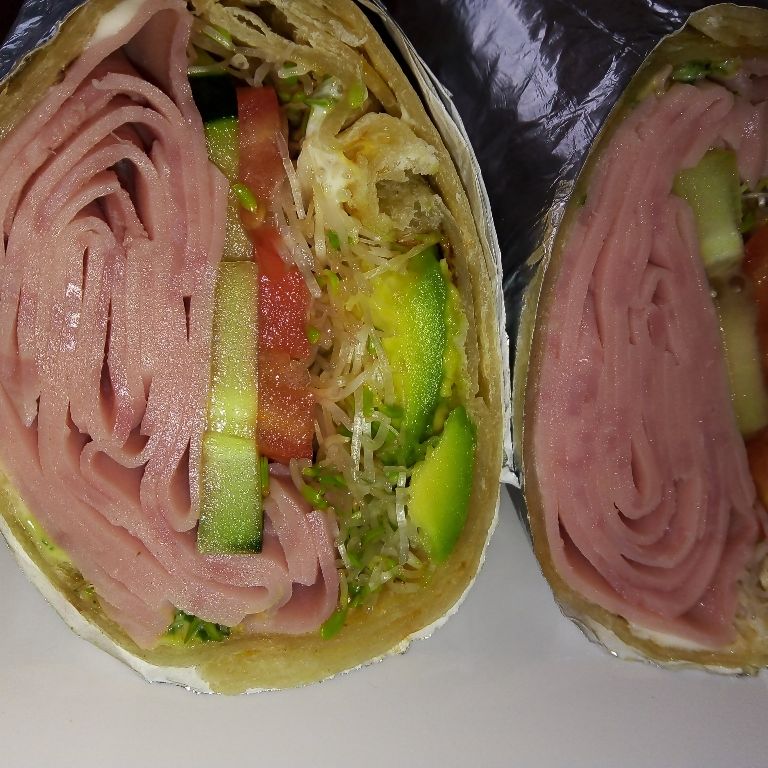 Jamón de pavo, mayonesa, cilantro, jitomate, germinado, aguacate y pepino.