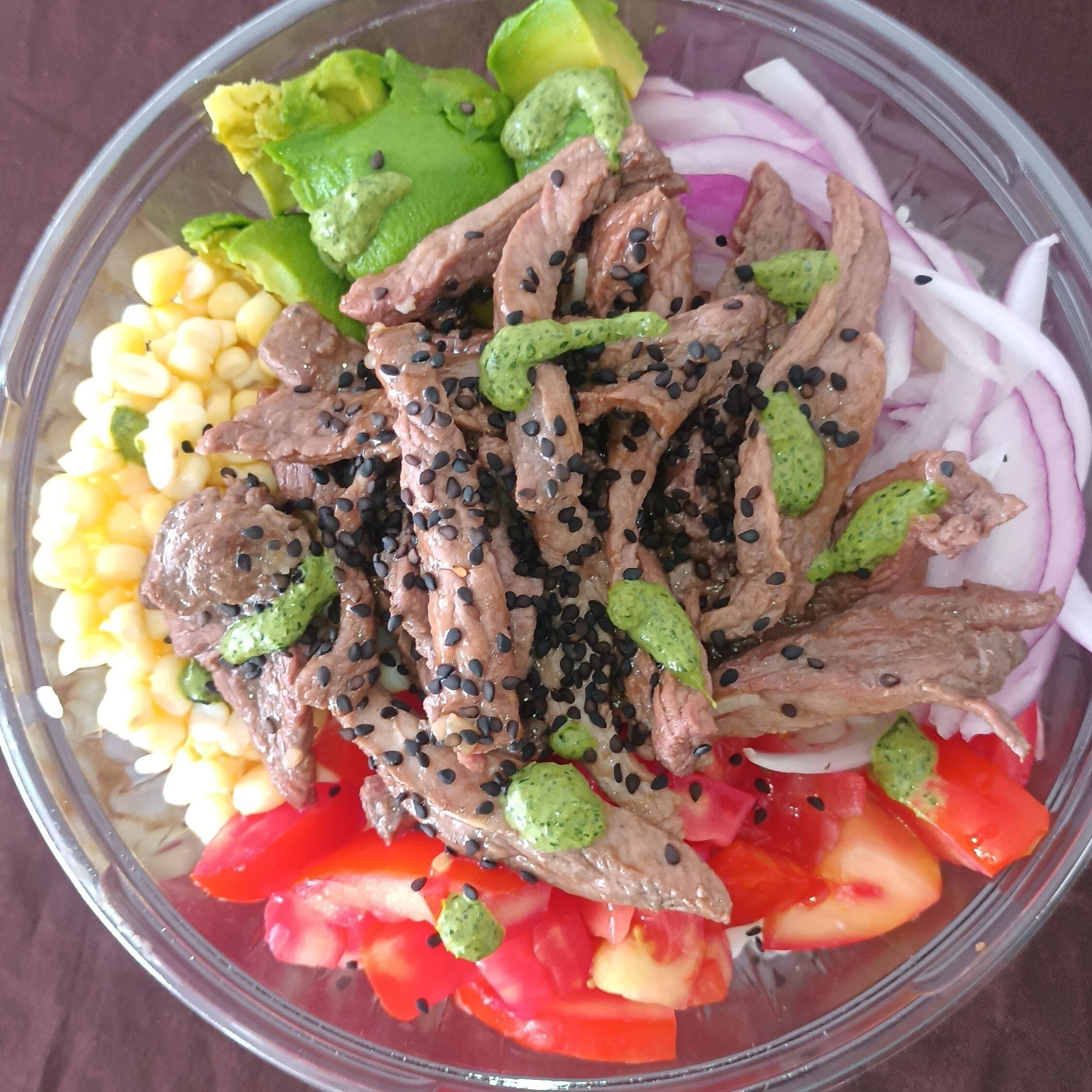 Base de arroz Gohan, jitomate, aguacate, cebolla morada, elote, aioli de cilantro y semilla de ajonjolí
