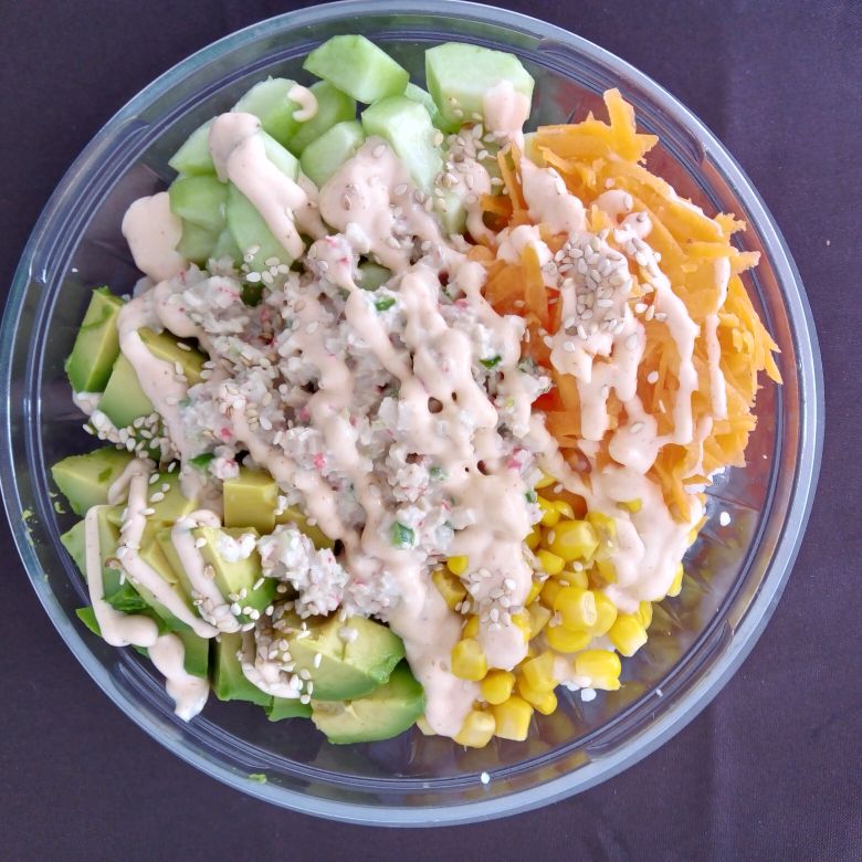 Base de arroz gohan, zanahoria, elote, pepino, aguacate, con mayosiracha y ajonjolí tostado.