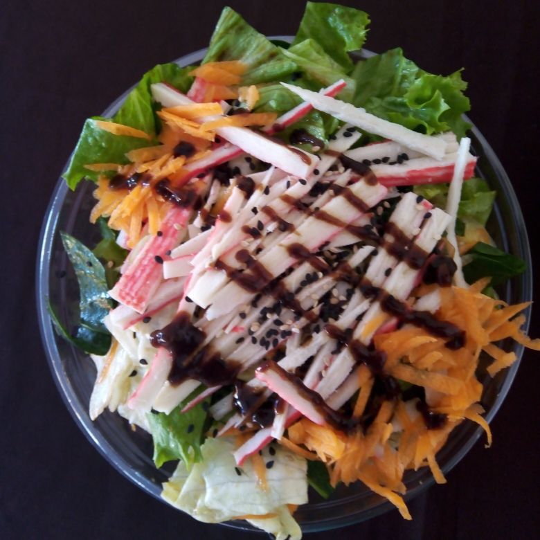 Base de lechuga y espinaca con surimi, cebolla morada, zanahoria, apio, ajonjolí tostado y vinagreta de la casa.