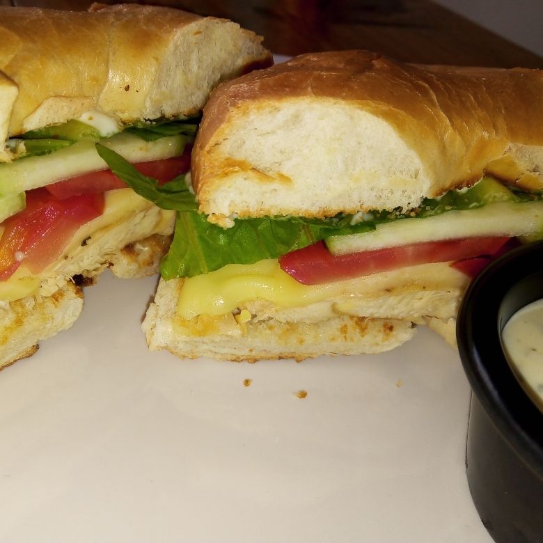 Bagel de pollo con queso gratinado, pepino, lechuga, germen, mayonesa chipotle y porción de ensalada.