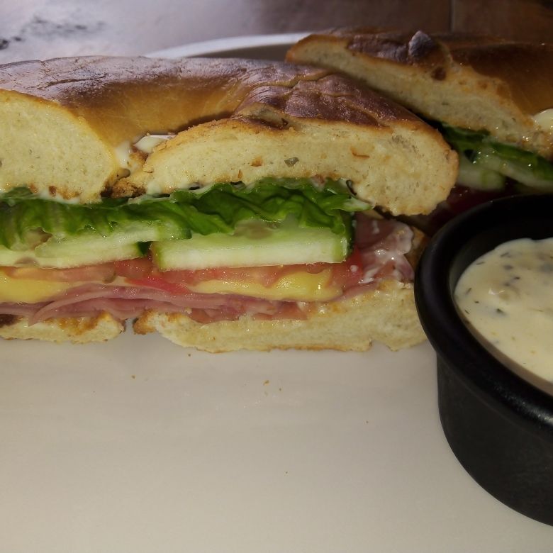 Pan bagel con lechuga, jitomate, pepino, queso manchego y mayonesa.