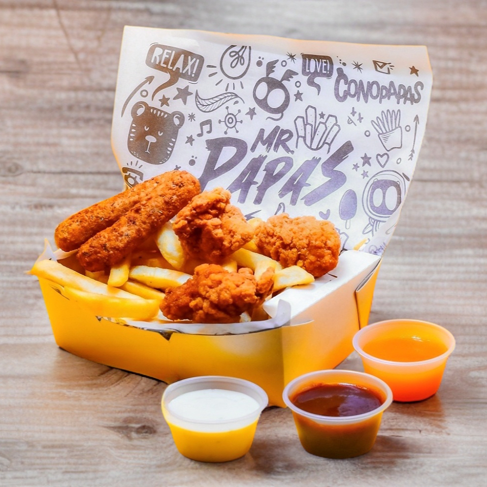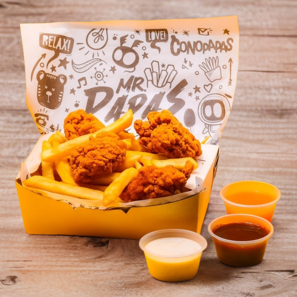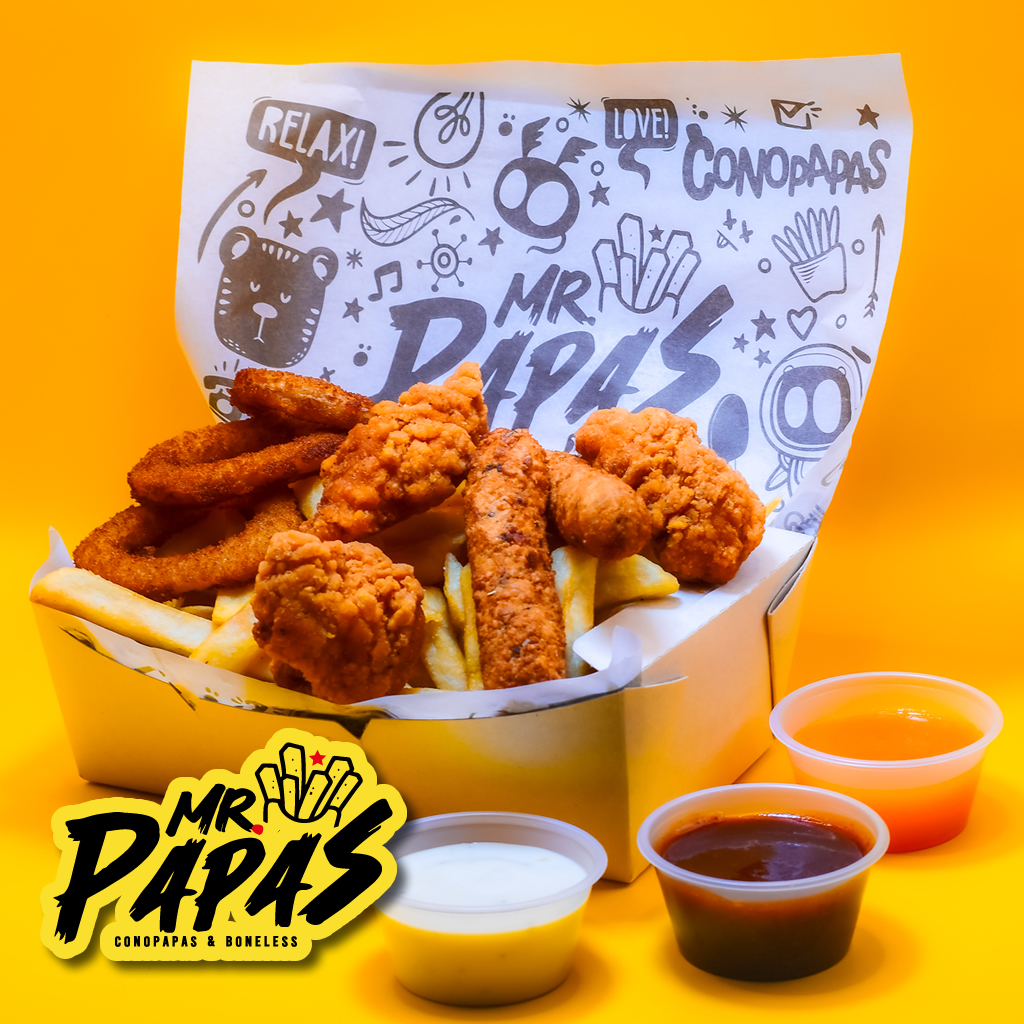 Orden de Papas, Boneless y 2 Dedos de Queso, acompañados de 3 Aderezos aparte a Elegir.