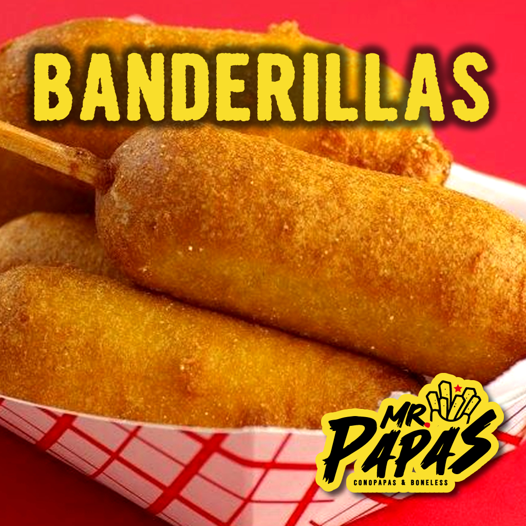 Orden de 6 Mini Banderillas, acompañadas de sus Dips de Catsup, Queso y BBQ.