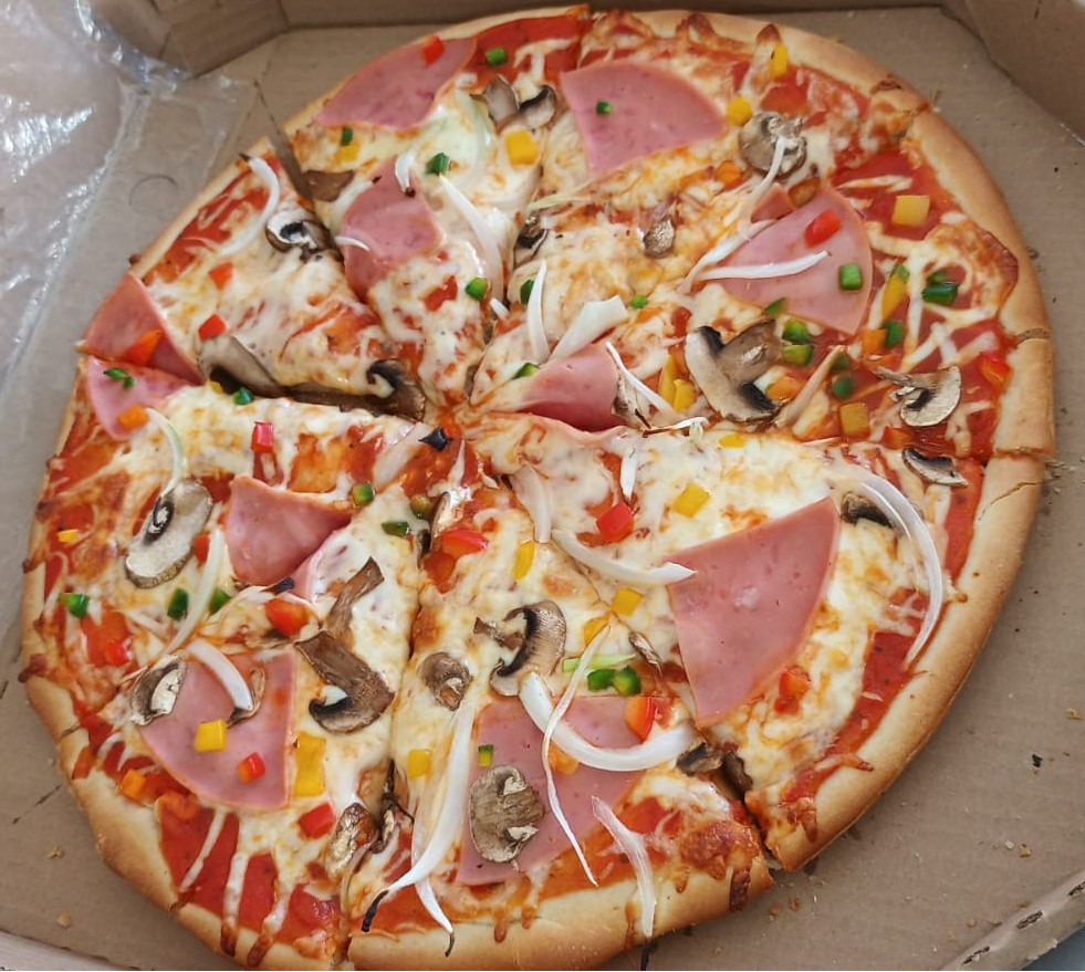 Pizza de peperoni, jamón, chorizo y tocino , 8 rebanadas.