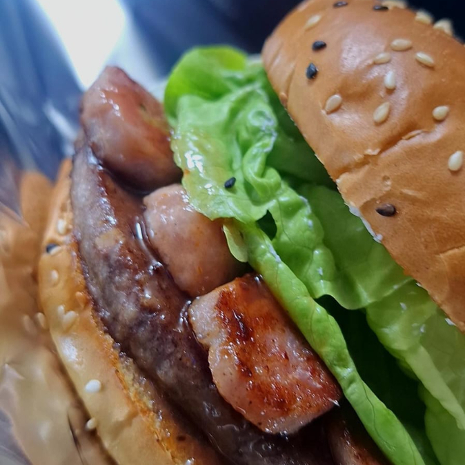 Pan parrillero, carne Sirloin, champiñón fileteado, queso manchego, lechuga, jitomate, mostaza, catsup y mayonesa, acompañando de 1 aderezo a elegir aparte