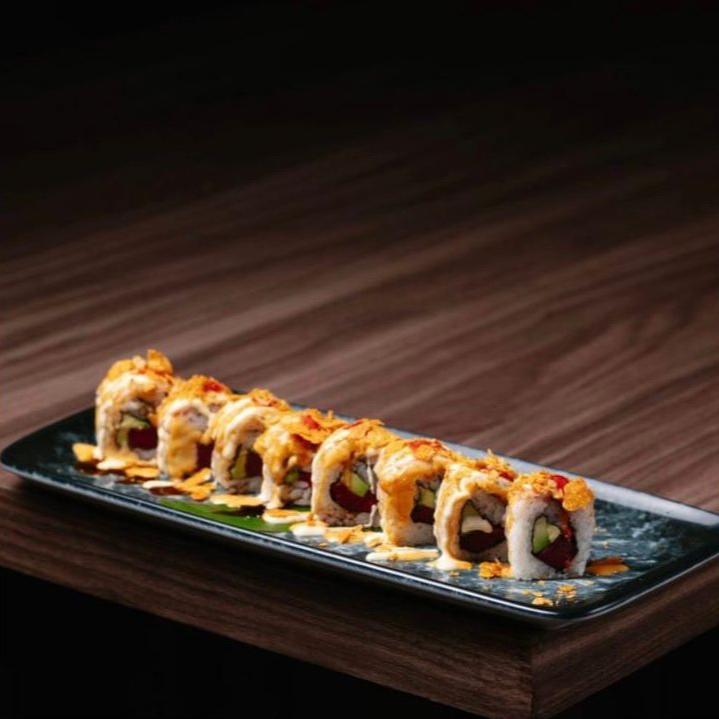Atún y aguacate por dentro. camarón , sriracha, spicy mayo , salsa kosh y chispas crispy spicy por fuera.