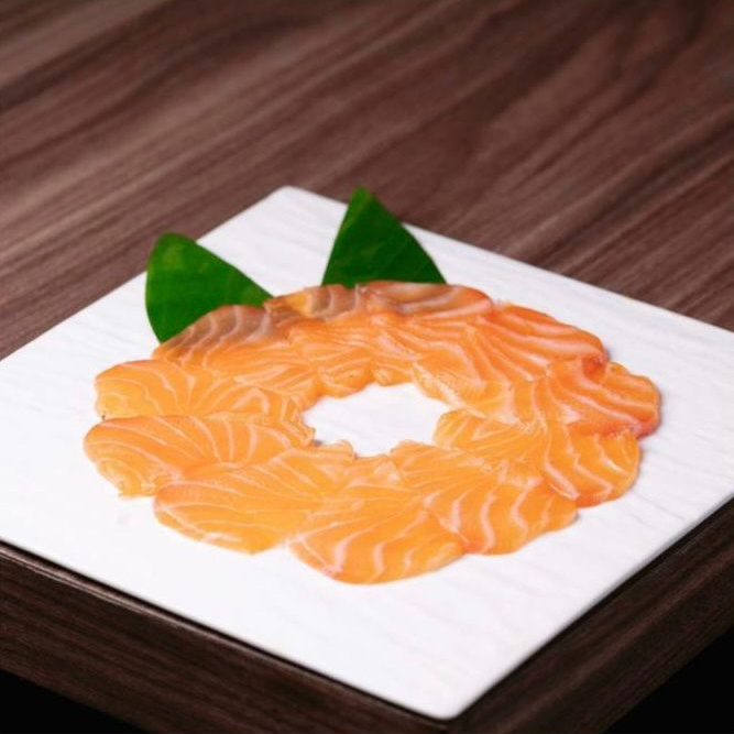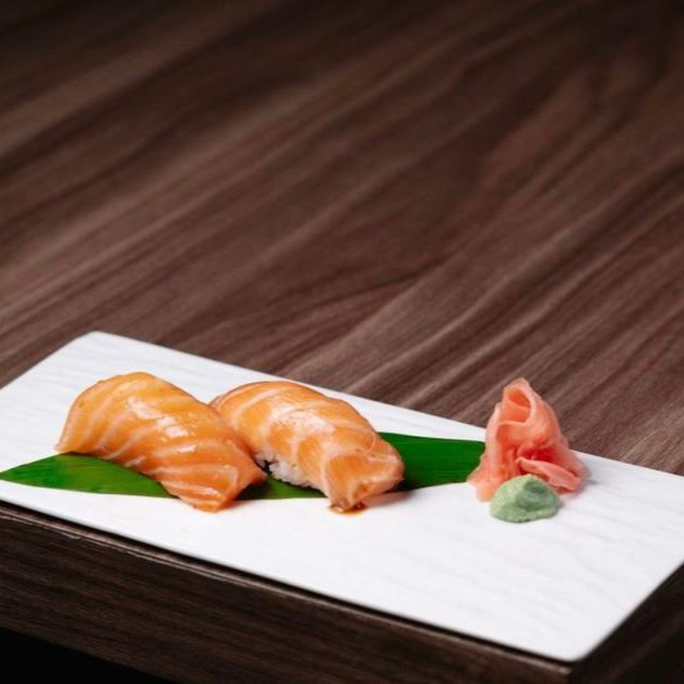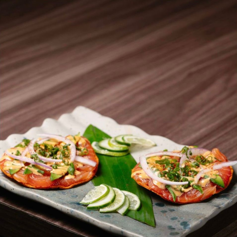 Tostadas de salmón , aguacate , cebolla morada , cilantro , spicy mayo y un toque de togarashi. (2 piezas)