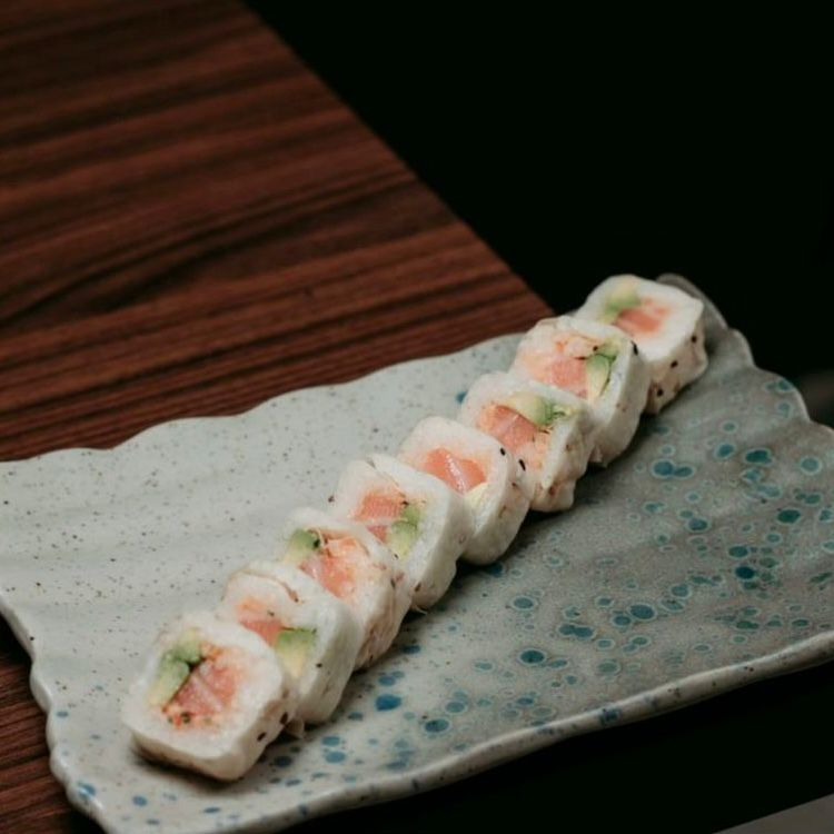 Salmón spicy, aguacate, cebollín por dentro. Alga blanca por fuera.