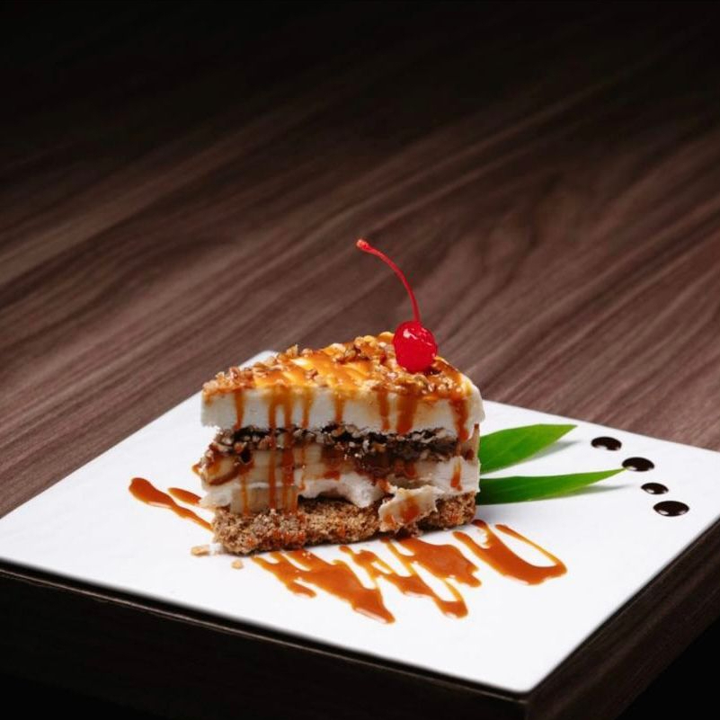 Rebanada de mostachón hecha a base de galleta, queso mascarpone, nuez y cajeta