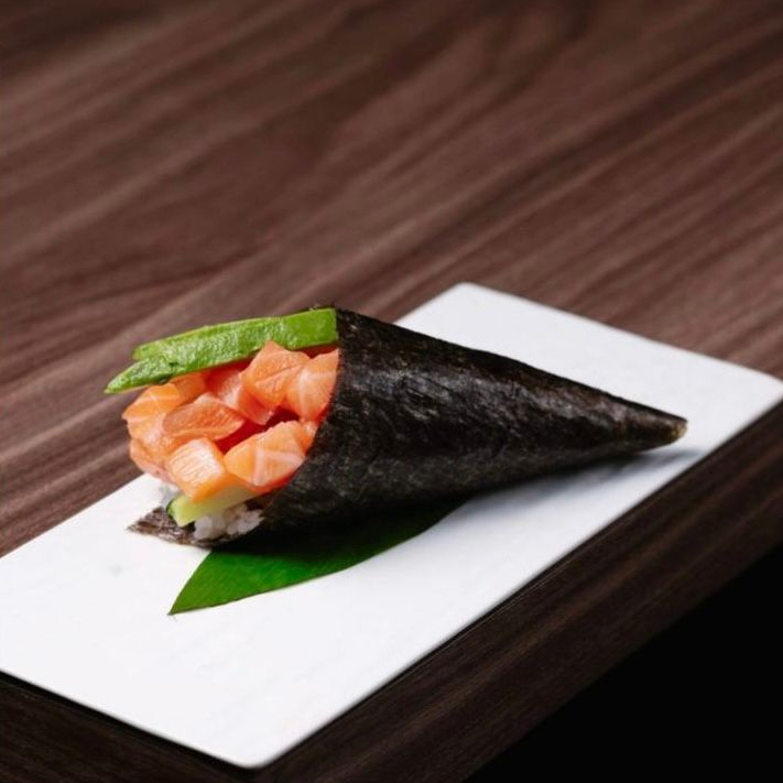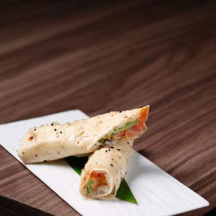 Hoja de alga blanca rellena con arroz , salmón , aguacate y salsa dinamita.